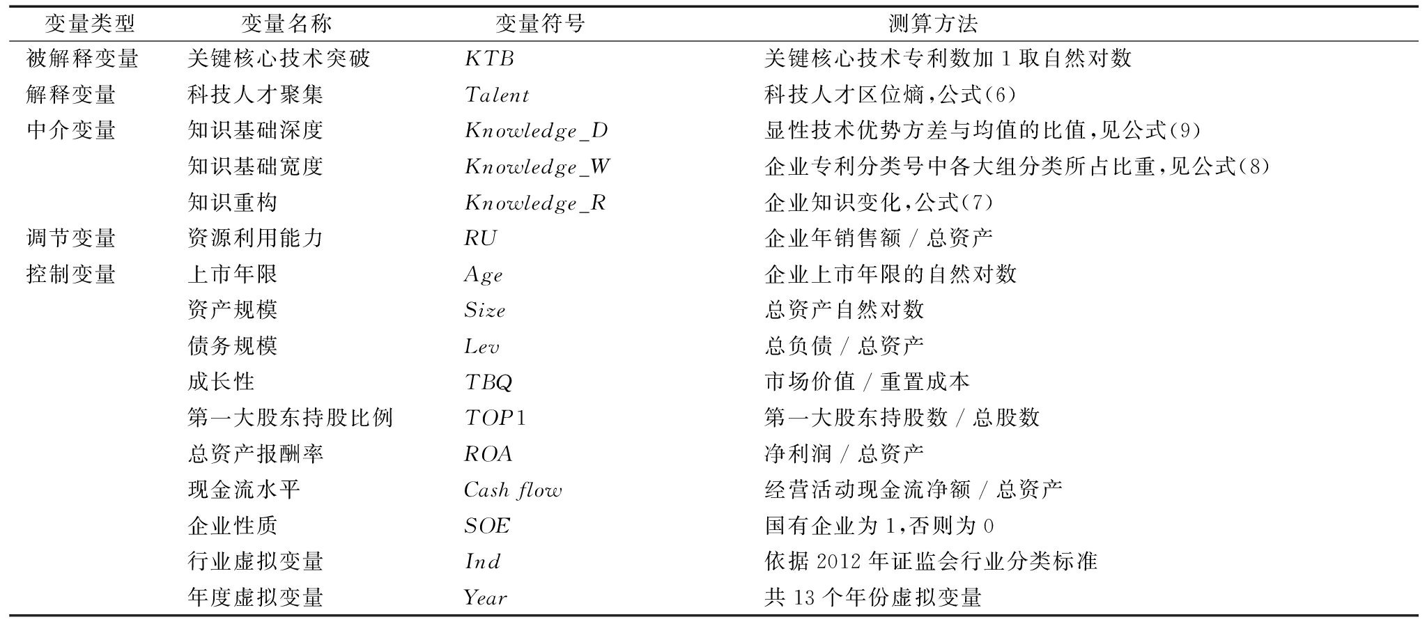 变量类型变量名称变量符号 测算方法被解释变量关键核心技术突破KTB关键核心技术专利数加1取自然对数解释变量科技人才聚集Talent科技人才区位熵,公式(6)中介变量知识基础深度Knowledge_D显性技术优势方差与均值的比值,见公式(9)知识基础宽度Knowledge_W企业专利分类号中各大组分类所占比重,见公式(8)知识重构Knowledge_R企业知识变化,公式(7)调节变量资源利用能力RU企业年销售额/总资产控制变量上市年限Age企业上市年限的自然对数资产规模Size总资产自然对数债务规模Lev总负债/总资产成长性TBQ市场价值/重置成本第一大股东持股比例TOP1第一大股东持股数/总股数总资产报酬率ROA净利润/总资产现金流水平Cash flow经营活动现金流净额/总资产企业性质SOE国有企业为1,否则为0行业虚拟变量Ind依据2012年证监会行业分类标准年度虚拟变量Year共13个年份虚拟变量