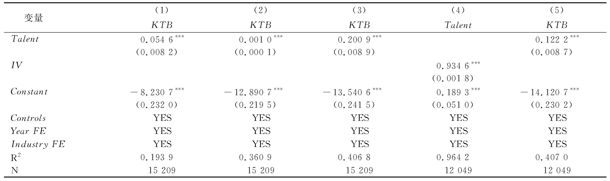 变量(1)(2)(3)(4)(5)KTBKTBKTBTalentKTBTalent0.054 6***0.001 0***0.200 9***0.122 2***(0.008 2)(0.000 1)(0.008 9)(0.008 7)IV0.934 6***(0.001 8)Constant-8.230 7***-12.890 7***-13.540 6***0.189 3***-14.120 7***(0.232 0)(0.219 5)(0.241 5)(0.051 0)(0.230 2)ControlsYESYESYESYESYESYear FEYESYESYESYESYESIndustry FEYESYESYESYESYESR20.193 90.360 90.406 80.964 20.407 0N15 20915 20915 20912 04912 049