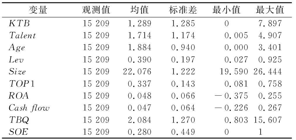 变量观测值均值标准差最小值最大值KTB15 2091.2891.28507.897Talent15 2091.7141.1740.0054.907Age15 2091.8840.9400.0003.401Lev15 2090.3900.1970.0270.925Size15 20922.0761.22219.59026.444TOP115 2090.3370.1430.0810.758ROA15 2090.0480.066-0.3750.255Cash flow15 2090.0470.064-0.2260.267TBQ15 2092.0841.2700.80315.607SOE15 2090.2800.44901