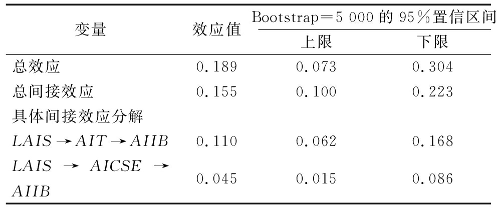 变量效应值Bootstrap=5 000的95%置信区间上限下限总效应 0.1890.0730.304总间接效应 0.1550.1000.223具体间接效应分解LAIS→AIT→AIIB 0.1100.0620.168LAIS→AICSE→AIIB 0.0450.0150.086