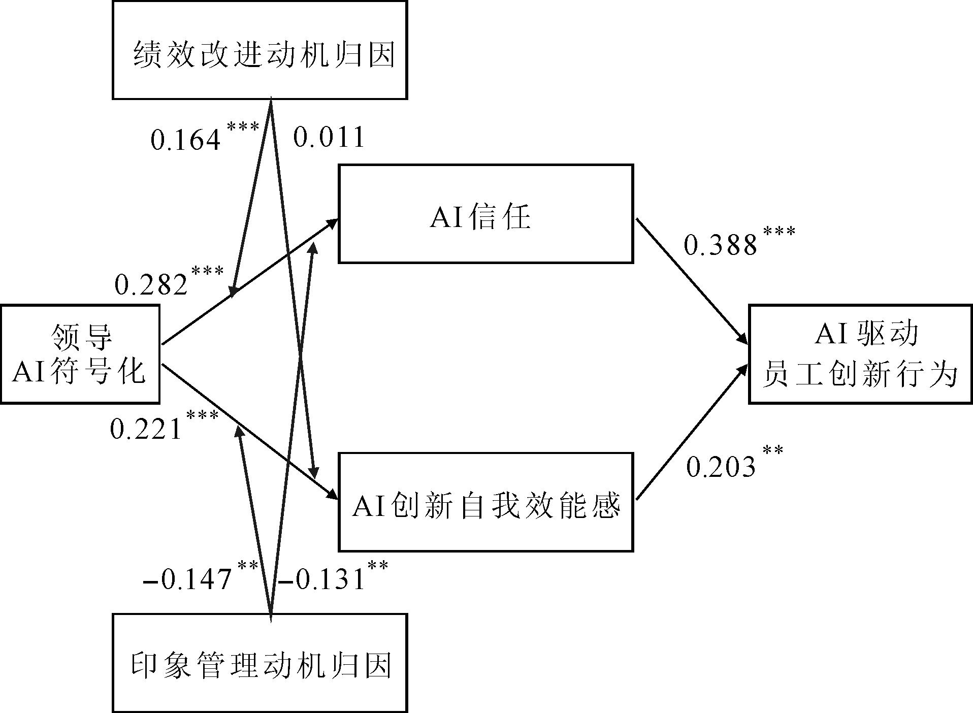 本文基于社会认知理论和归因理论,探究领导AI符号化对AI驱动员工创新行为的影响,从技术认知和自我认知两方面分别检验了AI信任和AI创新自我效能感的中介作用,以及员工归因的领导AI符号化动机的调节作用。结果表明,领导AI符号化分别通过AI信任和AI创新自我效能感正向影响AI驱动员工创新行为,说明领导AI符号化具有技术认知和自我认知两种赋能功效。此外,当员工归因的领导AI符号化动机为绩效改进时,领导AI符号化对员工AI信任的正向影响变强,进而促进AI驱动员工创新行为;反之,若归因于印象管理时,领导AI符号化对员工AI信任以及AI创新自我效能感的正向影响变弱,进而降低AI驱动员工创新行为。