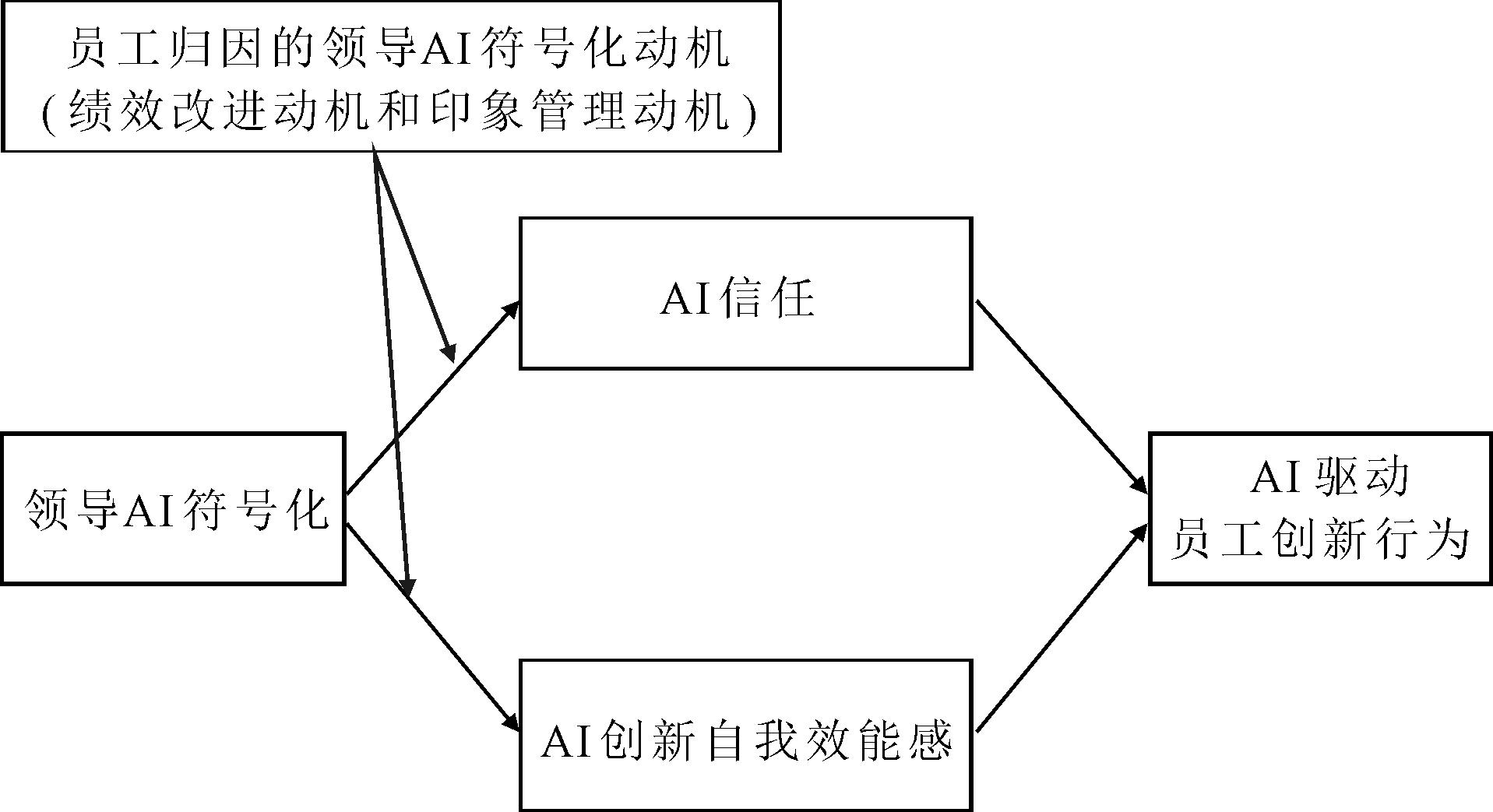 当员工将领导AI符号化归因于绩效改进动机时,即是领导者基于组织绩效提升的实质性考量,而非技术跟风或形象塑造,这种积极归因会强化领导AI符号化对员工AI信任的正向影响。具体而言:一方面,当员工认为领导AI符号化源自对效率提升与问题解决的真实追求时,则更可能将领导者视为前瞻创新的引领者,相信其决策是基于组织未来发展的考虑,而非盲目跟风,从而激发员工对AI潜力的积极预期[26],增加AI信任。另一方面,当员工认为领导AI符号化旨在绩效改进时,则更加相信领导者已对AI实际效益进行了审慎评估,能够有效缓解对AI应用不确定性和潜在风险的担忧[32],提升个体对AI的信任程度。进一步地,AI信任的提升不仅能够降低个体对AI技术采纳的心理障碍,强化对其工具价值的认可,而且更加倾向于探索AI在任务解决中的新颖应用,强化AI驱动员工创新行为。由此,本文提出假设:
