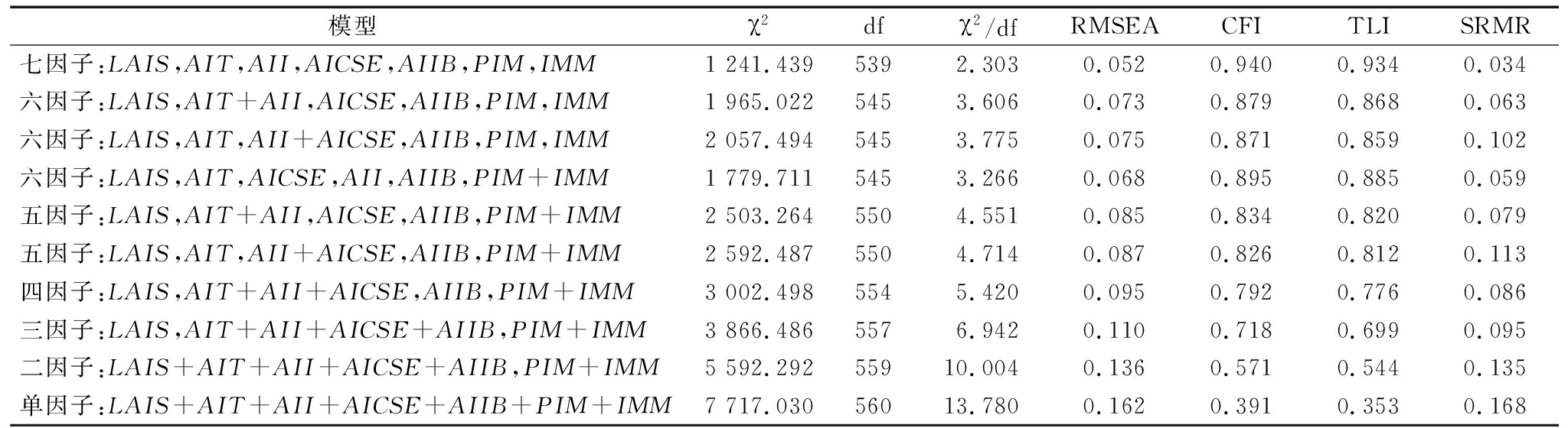 模型χ2dfχ2/dfRMSEACFITLISRMR七因子:LAIS,AIT,AII,AICSE,AIIB,PIM,IMM1 241.4395392.3030.0520.9400.9340.034六因子:LAIS,AIT+AII,AICSE,AIIB,PIM,IMM1 965.0225453.6060.0730.8790.8680.063六因子:LAIS,AIT,AII+AICSE,AIIB,PIM,IMM2 057.4945453.7750.0750.8710.8590.102六因子:LAIS,AIT,AICSE,AII,AIIB,PIM+IMM1 779.7115453.2660.0680.8950.8850.059五因子:LAIS,AIT+AII,AICSE,AIIB,PIM+IMM2 503.2645504.5510.0850.8340.8200.079五因子:LAIS,AIT,AII+AICSE,AIIB,PIM+IMM2 592.4875504.7140.0870.8260.8120.113四因子:LAIS,AIT+AII+AICSE,AIIB,PIM+IMM3 002.4985545.4200.0950.7920.7760.086三因子:LAIS,AIT+AII+AICSE+AIIB,PIM+IMM3 866.4865576.9420.1100.7180.6990.095二因子:LAIS+AIT+AII+AICSE+AIIB,PIM+IMM5 592.29255910.0040.1360.5710.5440.135单因子:LAIS+AIT+AII+AICSE+AIIB+PIM+IMM7 717.03056013.7800.1620.3910.3530.168