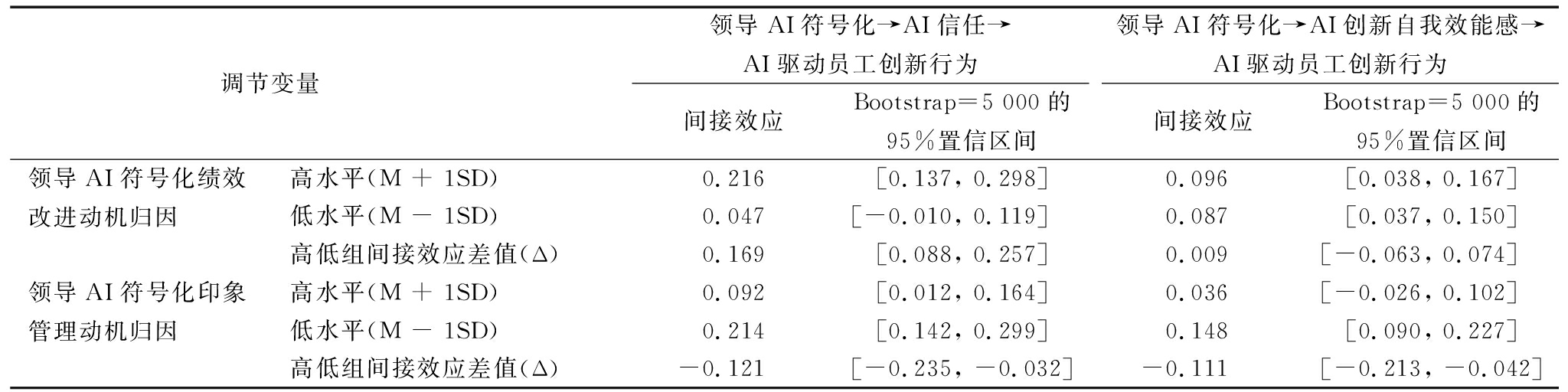 调节变量 领导AI符号化→AI信任→AI驱动员工创新行为间接效应Bootstrap=5 000的95%置信区间领导AI符号化→AI创新自我效能感→AI驱动员工创新行为间接效应Bootstrap=5 000的95%置信区间领导AI符号化绩效改进动机归因高水平(M + 1SD)0.216[0.137, 0.298]0.096[0.038, 0.167]低水平(M - 1SD)0.047[-0.010, 0.119]0.087[0.037, 0.150]高低组间接效应差值(Δ)0.169[0.088, 0.257]0.009[-0.063, 0.074]领导AI符号化印象管理动机归因高水平(M + 1SD)0.092[0.012, 0.164]0.036[-0.026, 0.102]低水平(M - 1SD)0.214[0.142, 0.299]0.148[0.090, 0.227]高低组间接效应差值(Δ)-0.121[-0.235, -0.032]-0.111[-0.213, -0.042]