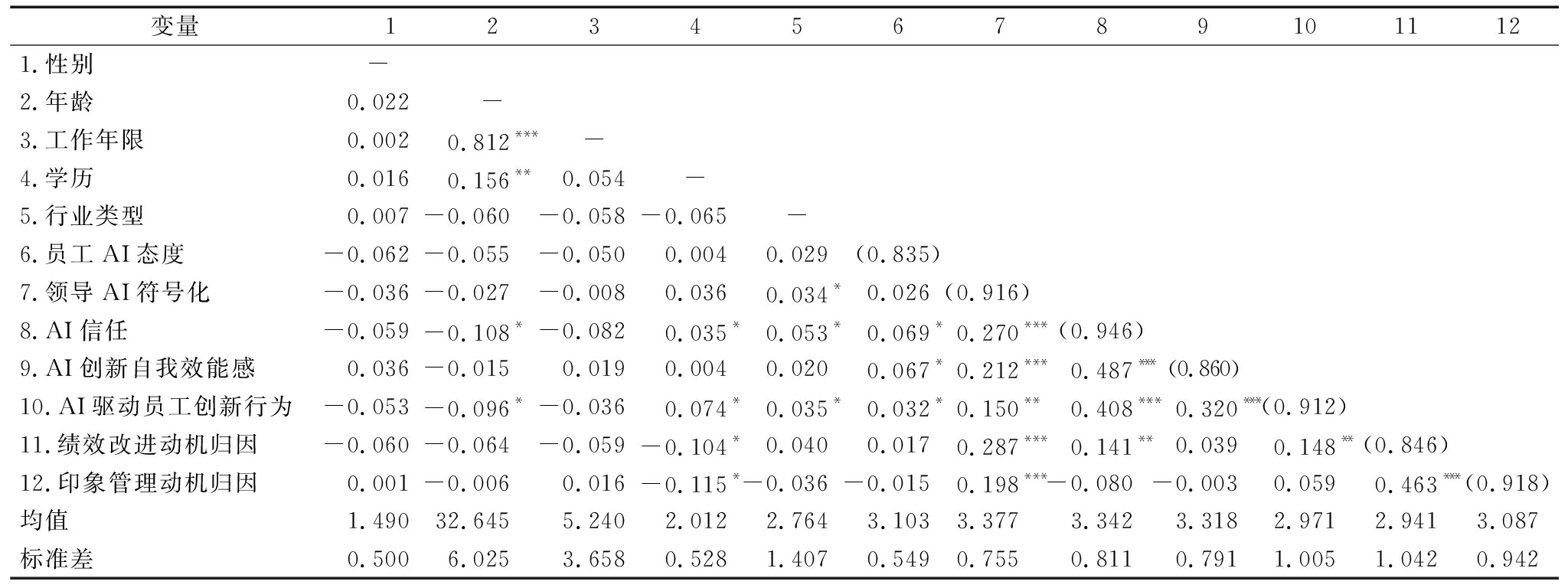 变量1234567891011121.性别- 2.年龄0.022 -3.工作年限0.0020.812***-4.学历0.0160.156**0.054-5.行业类型0.007-0.060-0.058-0.065 -6.员工AI态度-0.062-0.055-0.0500.0040.029(0.835)7.领导AI符号化-0.036-0.027-0.0080.0360.034*0.026(0.916) 8.AI信任-0.059-0.108*-0.0820.035*0.053*0.069*0.270***(0.946)9.AI创新自我效能感0.036-0.0150.0190.0040.0200.067*0.212***0.487***(0.860)10.AI驱动员工创新行为-0.053-0.096*-0.0360.074*0.035*0.032*0.150**0.408***0.320***(0.912)11.绩效改进动机归因-0.060-0.064-0.059-0.104*0.0400.0170.287***0.141**0.0390.148**(0.846)12.印象管理动机归因0.001-0.0060.016-0.115*-0.036-0.0150.198***-0.080-0.0030.0590.463***(0.918)均值1.49032.6455.2402.0122.7643.1033.3773.3423.3182.9712.9413.087标准差0.5006.0253.6580.5281.4070.5490.7550.8110.7911.0051.0420.942