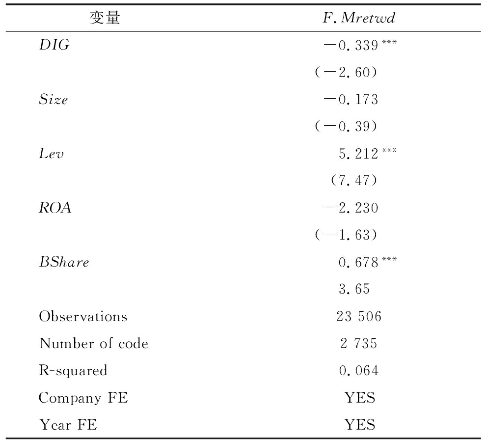 变量 F.MretwdDIG-0.339***(-2.60)Size-0.173(-0.39)Lev5.212***(7.47)ROA-2.230(-1.63)BShare0.678***3.65Observations23506Numberofcode2735R-squared0.064CompanyFEYESYearFEYES
