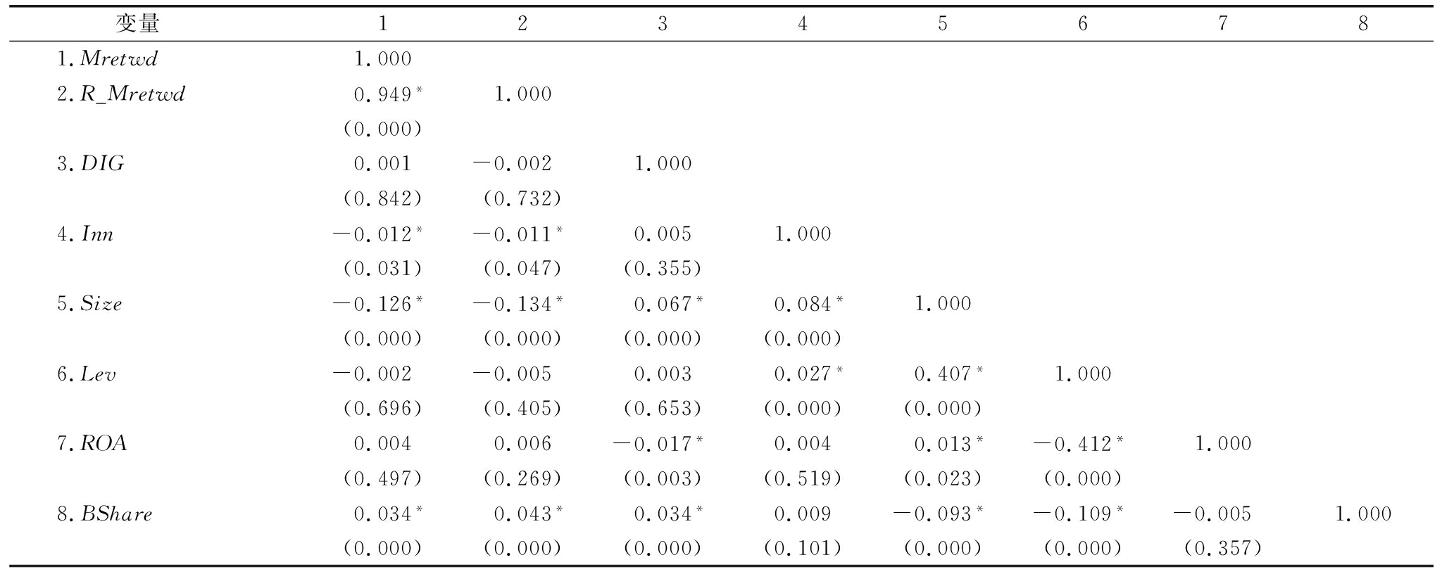 变量 123456781.Mretwd1.0002.R_Mretwd0.949*1.000(0.000)3.DIG0.001-0.0021.000(0.842)(0.732)4.Inn-0.012*-0.011*0.0051.000(0.031)(0.047)(0.355)5.Size-0.126*-0.134*0.067*0.084*1.000(0.000)(0.000)(0.000)(0.000)6.Lev-0.002-0.0050.0030.027*0.407*1.000(0.696)(0.405)(0.653)(0.000)(0.000)7.ROA0.0040.006-0.017*0.0040.013*-0.412*1.000(0.497)(0.269)(0.003)(0.519)(0.023)(0.000)8.BShare0.034*0.043*0.034*0.009-0.093*-0.109*-0.0051.000(0.000)(0.000)(0.000)(0.101)(0.000)(0.000)(0.357)