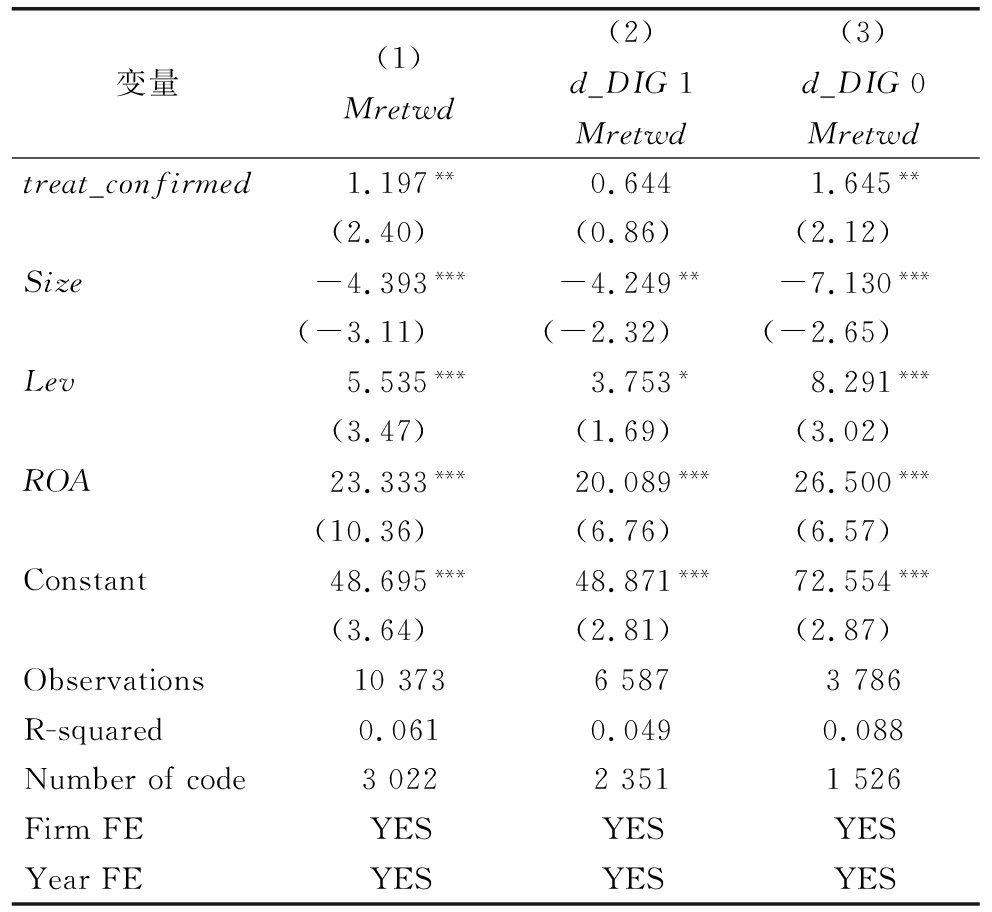 变量(1)Mretwd(2)d_DIG1Mretwd(3)d_DIG0Mretwdtreat_confirmed1.197**0.6441.645**(2.40)(0.86)(2.12)Size-4.393***-4.249**-7.130***(-3.11)(-2.32)(-2.65)Lev5.535***3.753*8.291***(3.47)(1.69)(3.02)ROA23.333***20.089***26.500***(10.36)(6.76)(6.57)Constant48.695***48.871***72.554***(3.64)(2.81)(2.87)Observations1037365873786R-squared0.0610.0490.088Numberofcode302223511526FirmFEYESYESYESYearFEYESYESYES