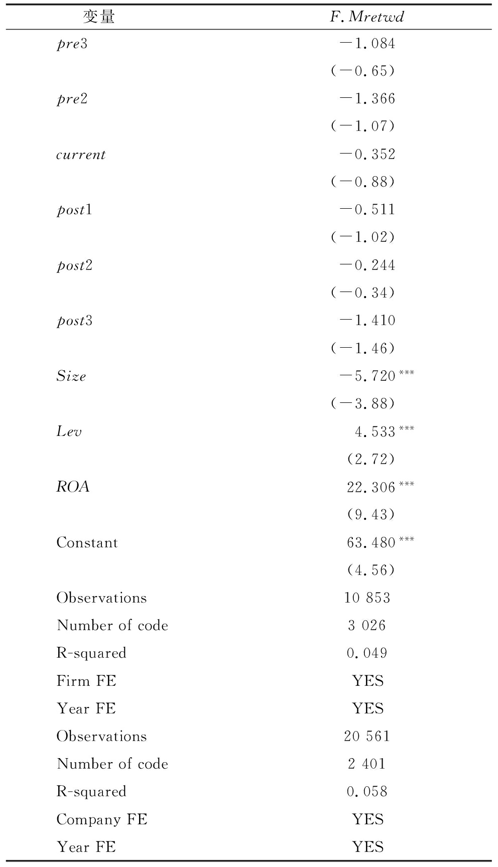 变量 F.Mretwdpre3-1.084(-0.65)pre2-1.366(-1.07)current-0.352(-0.88)post1-0.511(-1.02)post2-0.244(-0.34)post3-1.410(-1.46)Size-5.720***(-3.88)Lev4.533***(2.72)ROA22.306***(9.43)Constant63.480***(4.56)Observations10853Numberofcode3026R-squared0.049FirmFEYESYearFEYESObservations20561Numberofcode2401R-squared0.058CompanyFEYESYearFEYES