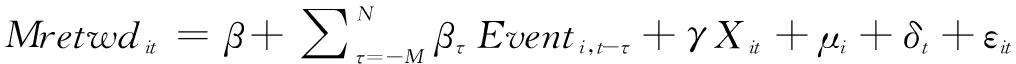 其中,βτEventi,t-τ为虚拟变量,如果企业i在t-τ期遭遇了冲击,则取值为1,否则为0(M、N分别表示政策时点前和政策时点后的期数),β0衡量危机发生当期的效果,β-M至β-1衡量发生冲击之前1-M期的效果。以全球突发公共卫生冲击事件发生前一期为基准期。