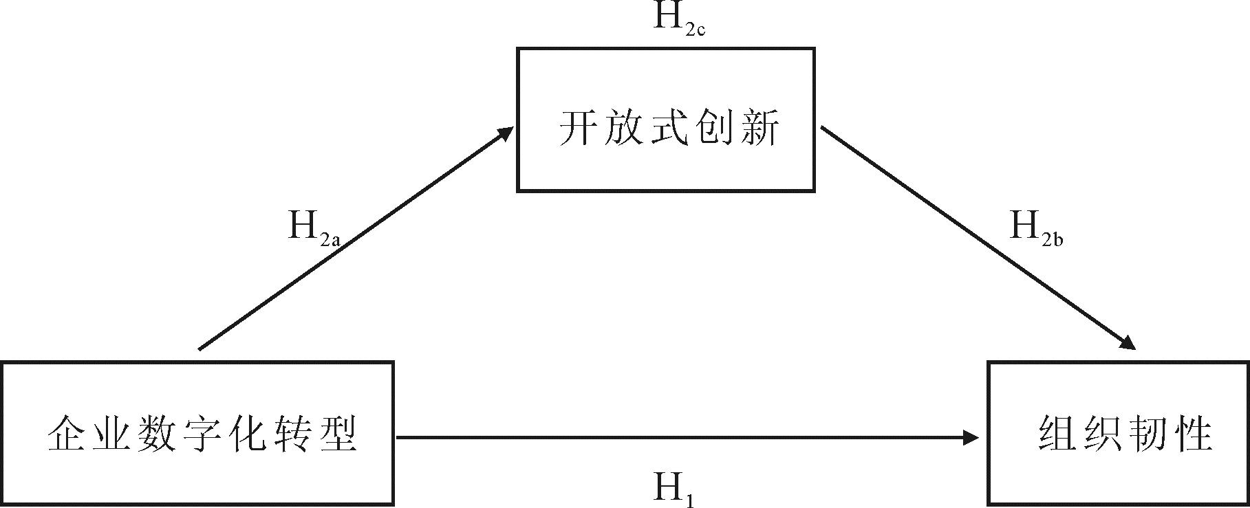 在动态能力视角下,数字化转型有助于解决企业开放式创新所遇到的瓶颈和问题,提升其效率和效能。数字化技术如区块链等,可以在知识产权的确定、转让、估值和维护等方面发挥重要作用,较好地破解开放式创新过程中的知识产权困境[17]。数字技术等手段可以使企业创新方式由传统的经验驱动转向数据驱动,使创新过程转向由全部门、上下游产业链乃至全社会都参与的开放式创新模式,提升研发流程的精准性,降低创新的不确定性。正如前文所述,根据假设H2a和H2b的推演,数字化转型通过降低成本、构建连接等方式促进开放式创新,开放式创新则进一步帮助企业提高危机感知能力应对环境变化,提升组织韧性;同时数字化转型能提升开放式创新效率和效能,并且解决开放式创新面临的一系列瓶颈问题,即开放式创新在二者关系中起到中介作用。因此,本文提出如下假设: