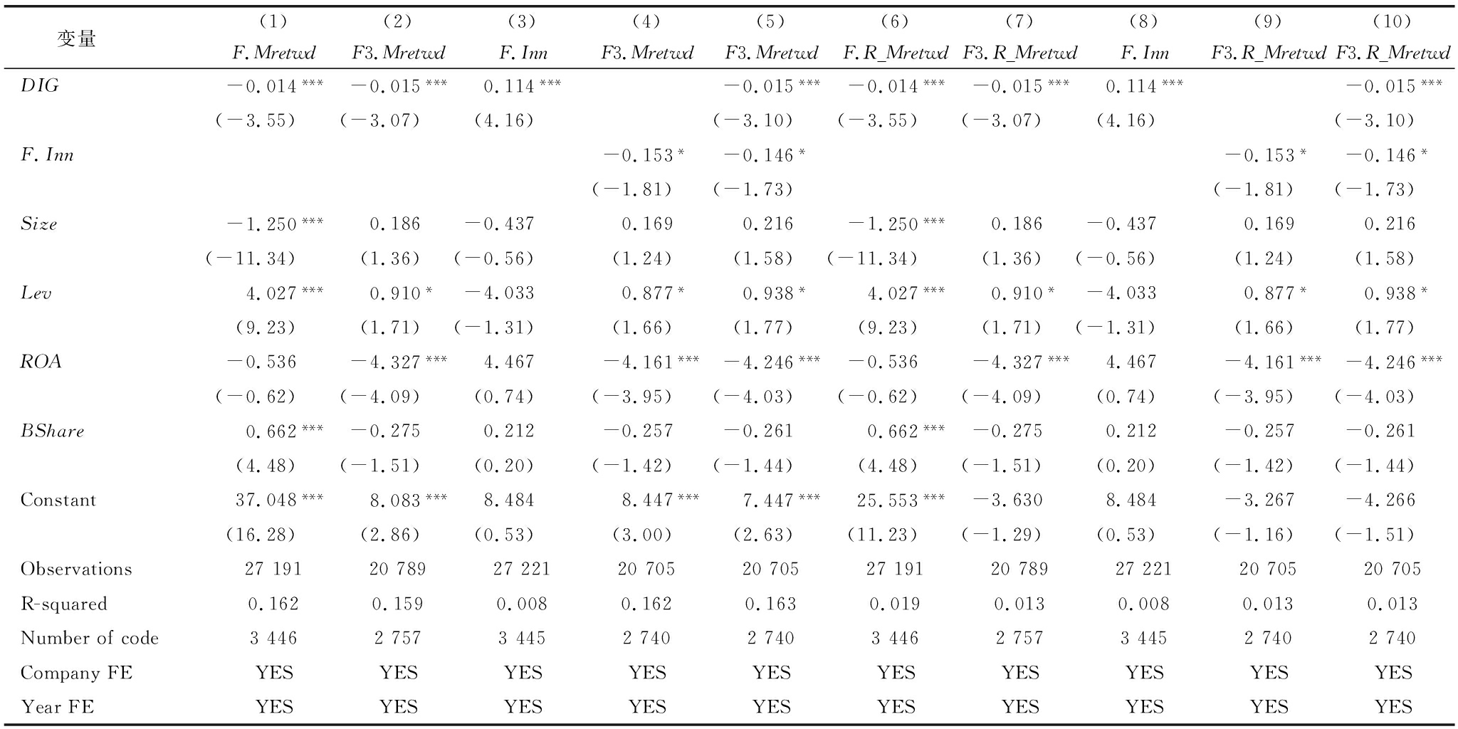 变量 (1)(2)(3)(4)(5)(6)(7)(8)(9)(10)F.MretwdF3.MretwdF.InnF3.MretwdF3.MretwdF.R_MretwdF3.R_MretwdF.InnF3.R_MretwdF3.R_MretwdDIG-0.014***-0.015***0.114***-0.015***-0.014***-0.015***0.114***-0.015***(-3.55)(-3.07)(4.16)(-3.10)(-3.55)(-3.07)(4.16)(-3.10)F.Inn-0.153*-0.146*-0.153*-0.146*(-1.81)(-1.73)(-1.81)(-1.73)Size-1.250***0.186-0.4370.1690.216-1.250***0.186-0.4370.1690.216(-11.34)(1.36)(-0.56)(1.24)(1.58)(-11.34)(1.36)(-0.56)(1.24)(1.58)Lev4.027***0.910*-4.0330.877*0.938*4.027***0.910*-4.0330.877*0.938*(9.23)(1.71)(-1.31)(1.66)(1.77)(9.23)(1.71)(-1.31)(1.66)(1.77)ROA-0.536-4.327***4.467-4.161***-4.246***-0.536-4.327***4.467-4.161***-4.246***(-0.62)(-4.09)(0.74)(-3.95)(-4.03)(-0.62)(-4.09)(0.74)(-3.95)(-4.03)BShare0.662***-0.2750.212-0.257-0.2610.662***-0.2750.212-0.257-0.261(4.48)(-1.51)(0.20)(-1.42)(-1.44)(4.48)(-1.51)(0.20)(-1.42)(-1.44)Constant37.048***8.083***8.4848.447***7.447***25.553***-3.6308.484-3.267-4.266(16.28)(2.86)(0.53)(3.00)(2.63)(11.23)(-1.29)(0.53)(-1.16)(-1.51)Observations27191207892722120705207052719120789272212070520705R-squared0.1620.1590.0080.1620.1630.0190.0130.0080.0130.013Numberofcode3446275734452740274034462757344527402740CompanyFEYESYESYESYESYESYESYESYESYESYESYearFEYESYESYESYESYESYESYESYESYESYES