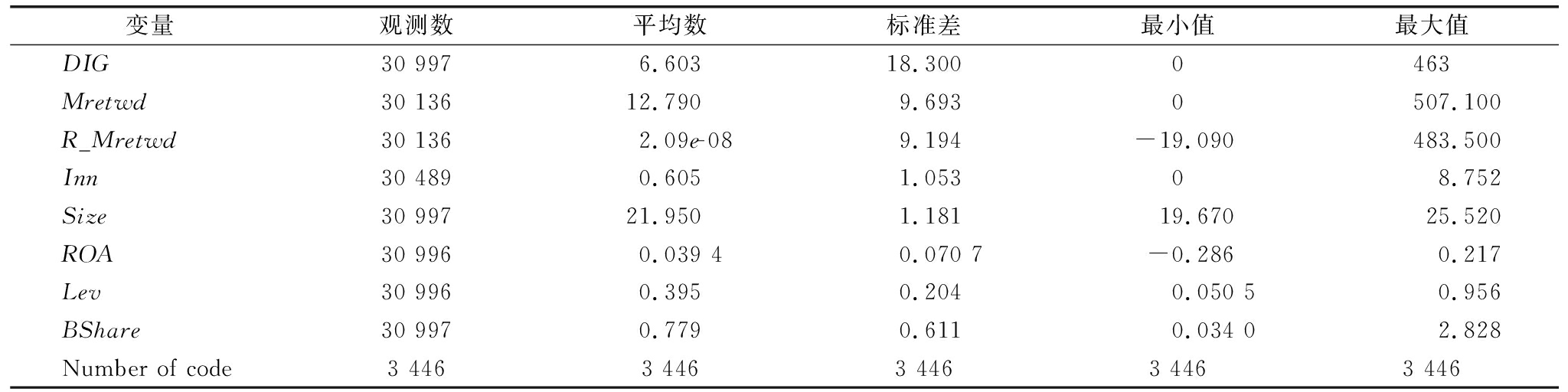变量观测数平均数标准差最小值最大值DIG309976.60318.3000463Mretwd3013612.7909.6930507.100R_Mretwd301362.09e-089.194-19.090483.500Inn304890.6051.05308.752Size3099721.9501.18119.67025.520ROA309960.03940.0707-0.2860.217Lev309960.3950.2040.05050.956BShare309970.7790.6110.03402.828Numberofcode34463446344634463446