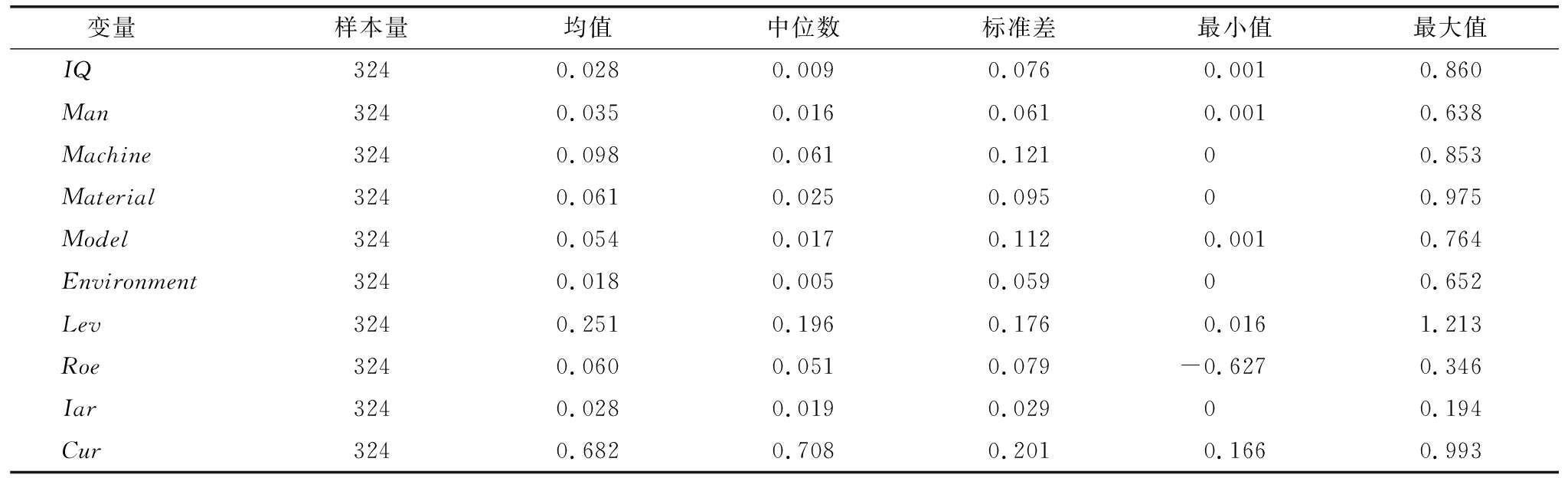 变量 样本量均值中位数标准差最小值最大值IQ3240.0280.0090.0760.0010.860Man3240.0350.0160.0610.0010.638Machine3240.0980.0610.12100.853Material3240.0610.0250.09500.975Model3240.0540.0170.1120.0010.764Environment3240.0180.0050.05900.652Lev3240.2510.1960.1760.0161.213Roe3240.0600.0510.079-0.6270.346Iar3240.0280.0190.02900.194Cur3240.6820.7080.2010.1660.993