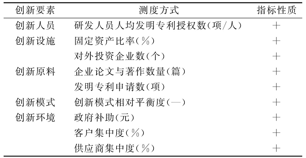 创新要素测度方式指标性质创新人员研发人员人均发明专利授权数(项/人)+创新设施固定资产比率(%)+对外投资企业数(个)+创新原料企业论文与著作数量(篇)+发明专利申请数(项)+创新模式创新模式相对平衡度(—)+创新环境政府补助(元)+客户集中度(%)+供应商集中度(%)+