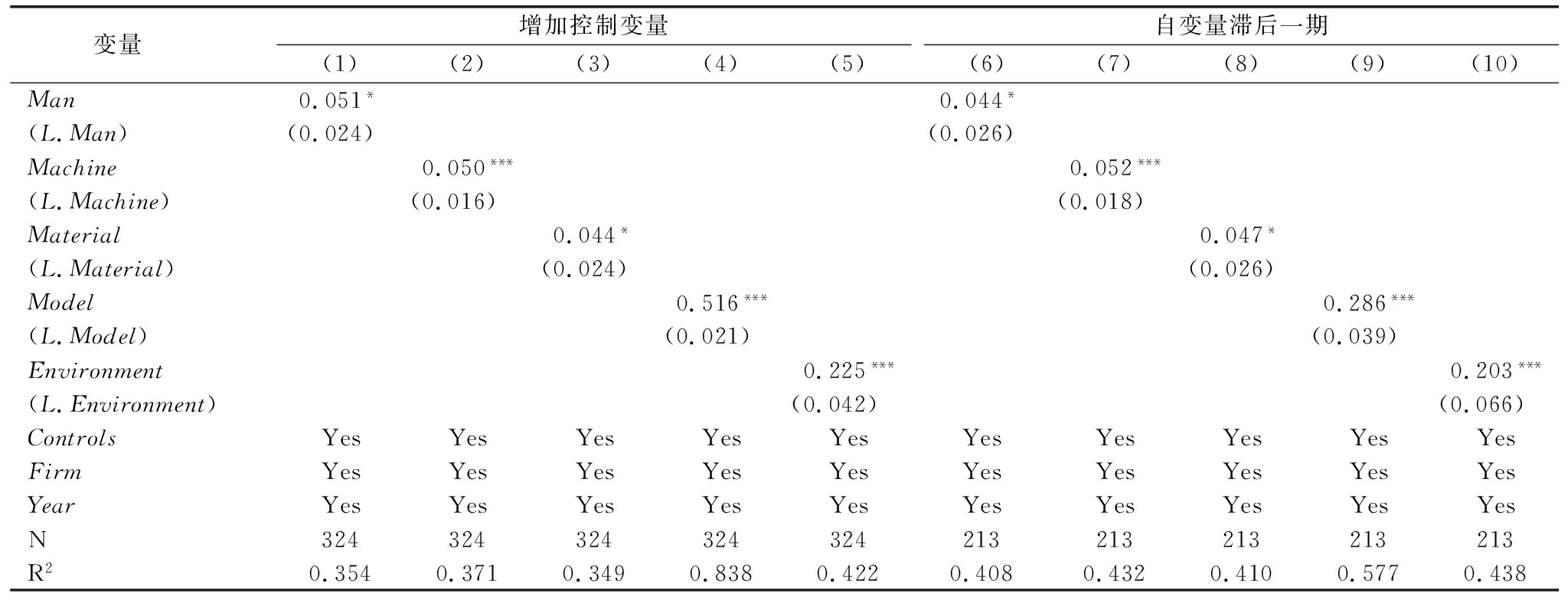 变量 增加控制变量(1)(2)(3)(4)(5)自变量滞后一期(6)(7)(8)(9)(10)Man0.051*0.044*(L.Man)(0.024)(0.026)Machine0.050***0.052***(L.Machine)(0.016)(0.018)Material0.044*0.047*(L.Material)(0.024)(0.026)Model0.516***0.286***(L.Model)(0.021)(0.039)Environment0.225***0.203***(L.Environment)(0.042)(0.066)ControlsYesYesYesYesYesYesYesYesYesYesFirmYesYesYesYesYesYesYesYesYesYesYearYesYesYesYesYesYesYesYesYesYesN324324324324324213213213213213R20.3540.3710.3490.8380.4220.4080.4320.4100.5770.438