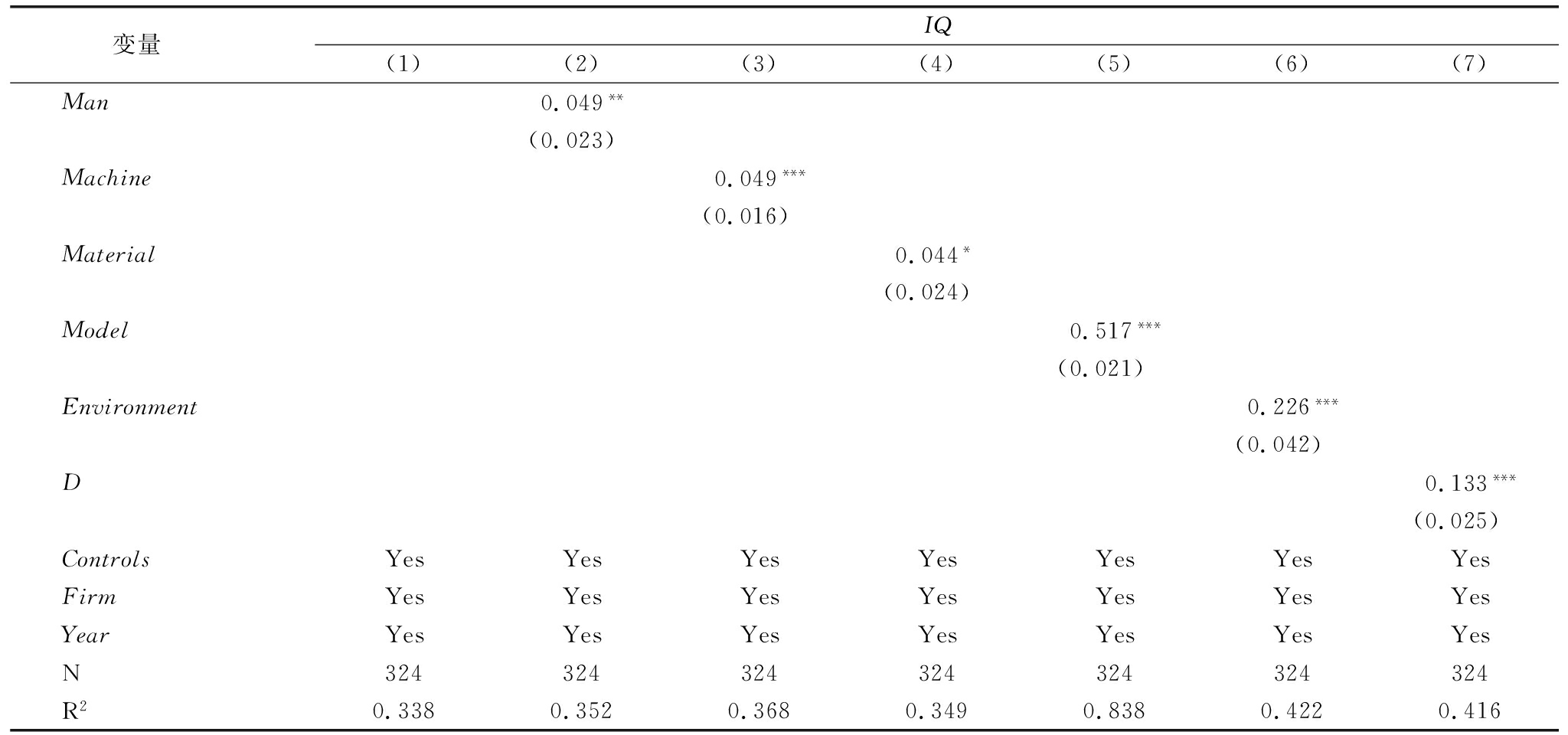变量 IQ(1)(2)(3)(4)(5)(6)(7)Man0.049**(0.023)Machine0.049***(0.016)Material0.044*(0.024)Model0.517***(0.021)Environment0.226***(0.042)D0.133***(0.025)ControlsYesYesYesYesYesYesYesFirmYesYesYesYesYesYesYesYearYesYesYesYesYesYesYesN324324324324324324324R20.3380.3520.3680.3490.8380.4220.416