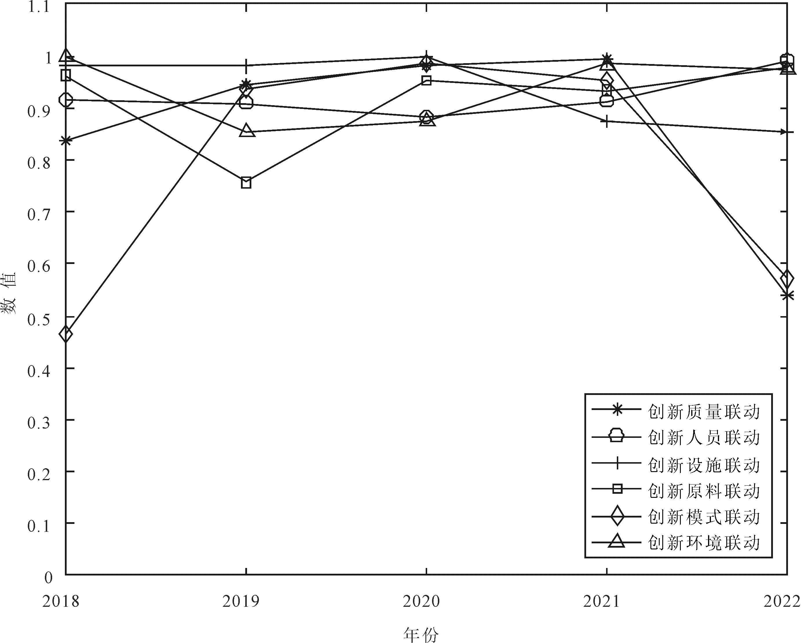 (2)环节间要素联动测度。根据式(2)绘制图2,发现创新人员、设施、原料和环境联动度呈平稳状态,创新模式联动度在2018—2021年呈现较好的发展趋势,但在2021年以后出现“大跳水”现象,导致创新质量联动度也随之下降,表明集成电路产业链环节间创新模式联动出现危机,长此以往会影响其它创新要素联动度。因此,需进一步分析如何改善环节间创新要素联动度以提升集成电路产业链整体创新质量。