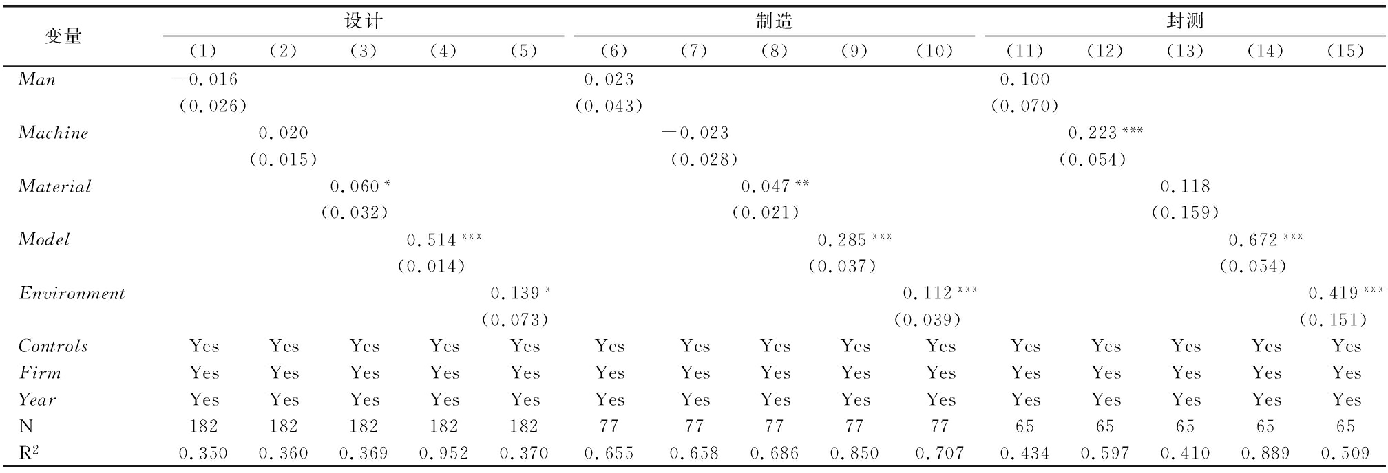 变量 设计(1)(2)(3)(4)(5)制造(6)(7)(8)(9)(10)封测(11)(12)(13)(14)(15)Man-0.0160.0230.100(0.026)(0.043)(0.070)Machine0.020-0.0230.223***(0.015)(0.028)(0.054)Material0.060*0.047**0.118(0.032)(0.021)(0.159)Model0.514***0.285***0.672***(0.014)(0.037)(0.054)Environment0.139*0.112***0.419***(0.073)(0.039)(0.151)ControlsYesYesYesYesYesYesYesYesYesYesYesYesYesYesYesFirmYesYesYesYesYesYesYesYesYesYesYesYesYesYesYesYearYesYesYesYesYesYesYesYesYesYesYesYesYesYesYesN18218218218218277777777776565656565R20.3500.3600.3690.9520.3700.6550.6580.6860.8500.7070.4340.5970.4100.8890.509