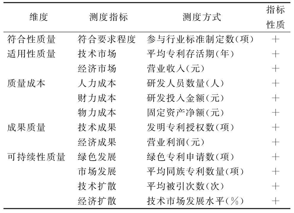 维度测度指标测度方式指标性质符合性质量符合要求程度参与行业标准制定数(项)+适用性质量技术市场平均专利存活期(年)+经济市场营业收入(元)+质量成本人力成本研发人员数量(人)+财力成本研发投入金额(元)+物力成本固定资产净额(元)+成果质量技术成果发明专利授权数(项)+经济成果营业利润(元)+可持续性质量绿色发展绿色专利申请数(项)+市场发展平均同族专利数量(项)+技术扩散平均被引次数(次)+经济扩散技术市场发展水平(%)+