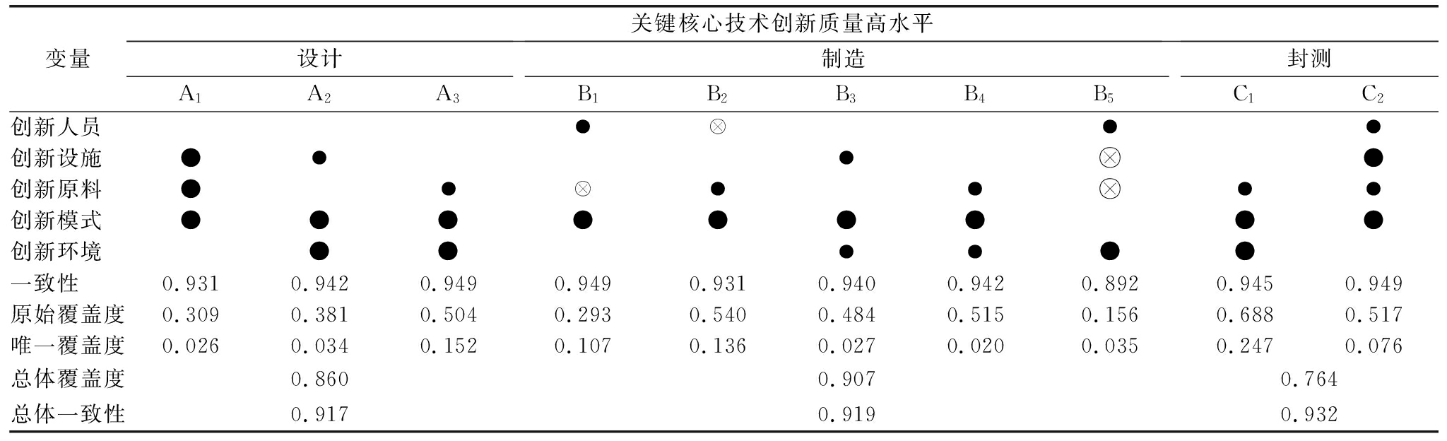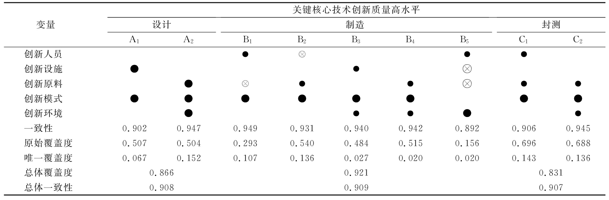 变量关键核心技术创新质量高水平设计A1A2A3制造B1B2B3B4B5封测C1C2创新人员 ● ●●创新设施 ●●● ●创新原料 ●● ●● ●●创新模式 ●●●●●●●●●创新环境 ●●●●●●一致性 0.9310.9420.9490.9490.9310.9400.9420.8920.9450.949原始覆盖度0.3090.3810.5040.2930.5400.4840.5150.1560.6880.517唯一覆盖度0.0260.0340.1520.1070.1360.0270.0200.0350.2470.076总体覆盖度0.8600.9070.764总体一致性0.9170.9190.932