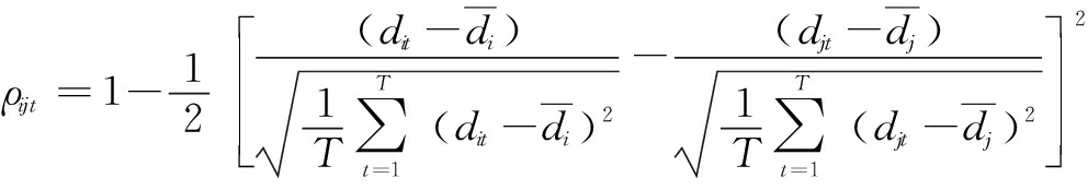 其中,ρijt为同步化指数,反映不同环节同一创新要素的联动度,用该指数衡量环节i和环节j之间创新要素在时期t的联动性,dit、djt分别表示环节i和环节j在时期t的创新要素水平,