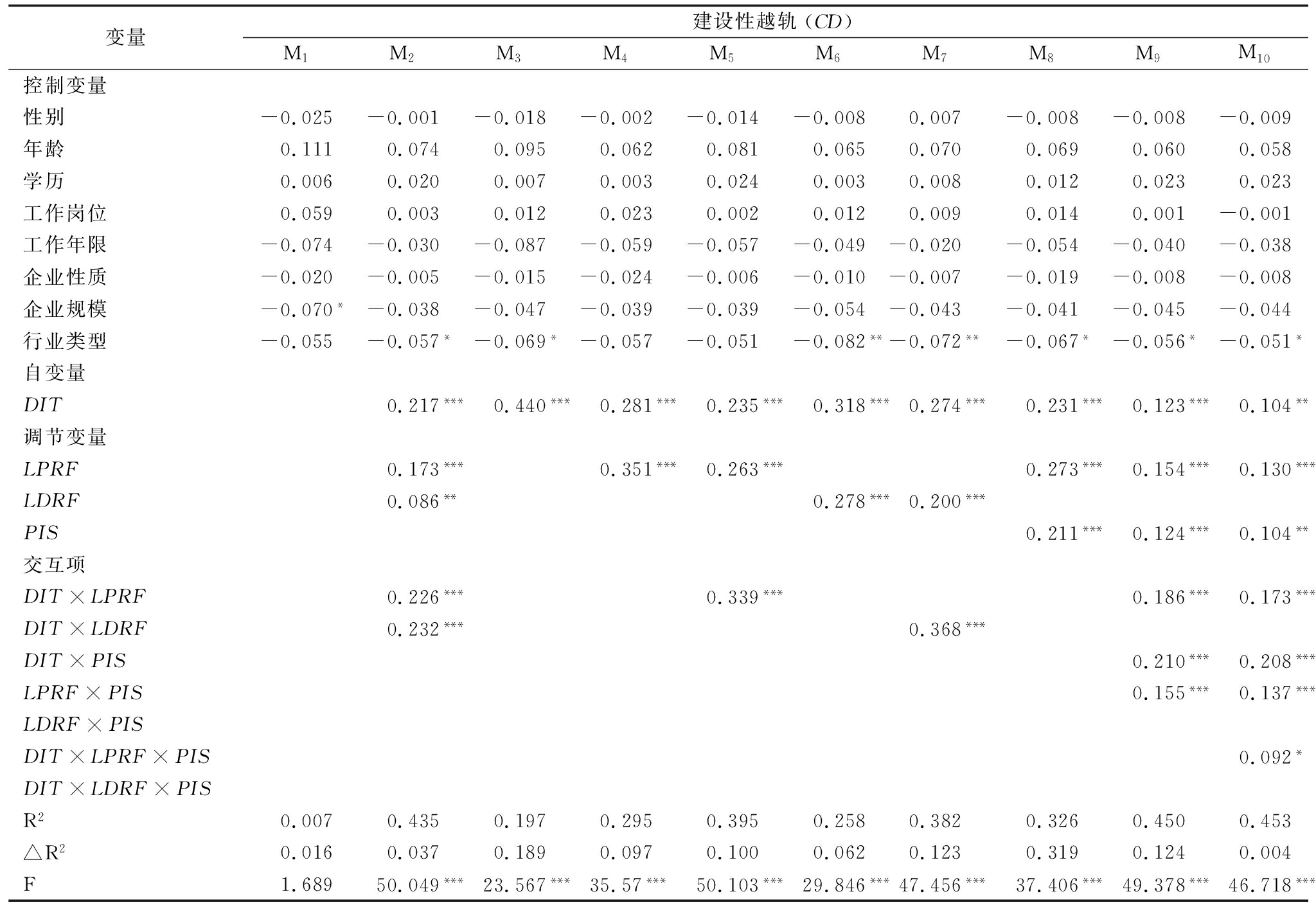 变量建设性越轨(CD)M1M2M3M4M5M6M7M8M9M10控制变量性别-0.025-0.001-0.018-0.002-0.014-0.0080.007-0.008-0.008-0.009年龄0.1110.0740.0950.0620.0810.0650.0700.0690.0600.058学历0.0060.0200.0070.0030.0240.0030.0080.0120.0230.023工作岗位0.0590.0030.0120.0230.0020.0120.0090.0140.001-0.001工作年限-0.074-0.030-0.087-0.059-0.057-0.049-0.020-0.054-0.040-0.038企业性质-0.020-0.005-0.015-0.024-0.006-0.010-0.007-0.019-0.008-0.008企业规模-0.070*-0.038-0.047-0.039-0.039-0.054-0.043-0.041-0.045-0.044行业类型-0.055-0.057*-0.069*-0.057-0.051-0.082**-0.072**-0.067*-0.056*-0.051*自变量DIT0.217***0.440***0.281***0.235***0.318***0.274***0.231***0.123***0.104**调节变量LPRF0.173***0.351***0.263***0.273***0.154***0.130***LDRF0.086**0.278***0.200***PIS0.211***0.124***0.104**交互项DIT×LPRF0.226***0.339***0.186***0.173***DIT×LDRF0.232***0.368***DIT×PIS0.210***0.208***LPRF×PIS0.155***0.137***LDRF×PISDIT×LPRF×PIS0.092*DIT×LDRF×PISR20.0070.4350.1970.2950.3950.2580.3820.3260.4500.453△R20.0160.0370.1890.0970.1000.0620.1230.3190.1240.004F1.68950.049***23.567***35.57***50.103***29.846***47.456***37.406***49.378***46.718***