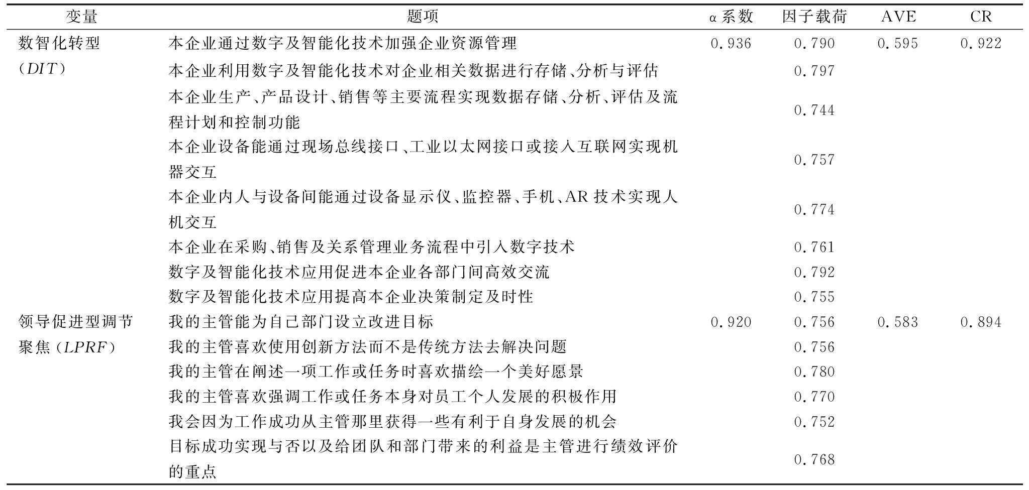 变量题项α系数因子载荷AVECR数智化转型(DIT)本企业通过数字及智能化技术加强企业资源管理0.9360.7900.5950.922本企业利用数字及智能化技术对企业相关数据进行存储、分析与评估0.797本企业生产、产品设计、销售等主要流程实现数据存储、分析、评估及流程计划和控制功能0.744本企业设备能通过现场总线接口、工业以太网接口或接入互联网实现机器交互0.757本企业内人与设备间能通过设备显示仪、监控器、手机、AR技术实现人机交互0.774本企业在采购、销售及关系管理业务流程中引入数字技术0.761数字及智能化技术应用促进本企业各部门间高效交流0.792数字及智能化技术应用提高本企业决策制定及时性0.755领导促进型调节聚焦(LPRF)我的主管能为自己部门设立改进目标0.9200.7560.5830.894我的主管喜欢使用创新方法而不是传统方法去解决问题0.756我的主管在阐述一项工作或任务时喜欢描绘一个美好愿景0.780我的主管喜欢强调工作或任务本身对员工个人发展的积极作用0.770我会因为工作成功从主管那里获得一些有利于自身发展的机会0.752目标成功实现与否以及给团队和部门带来的利益是主管进行绩效评价的重点0.768