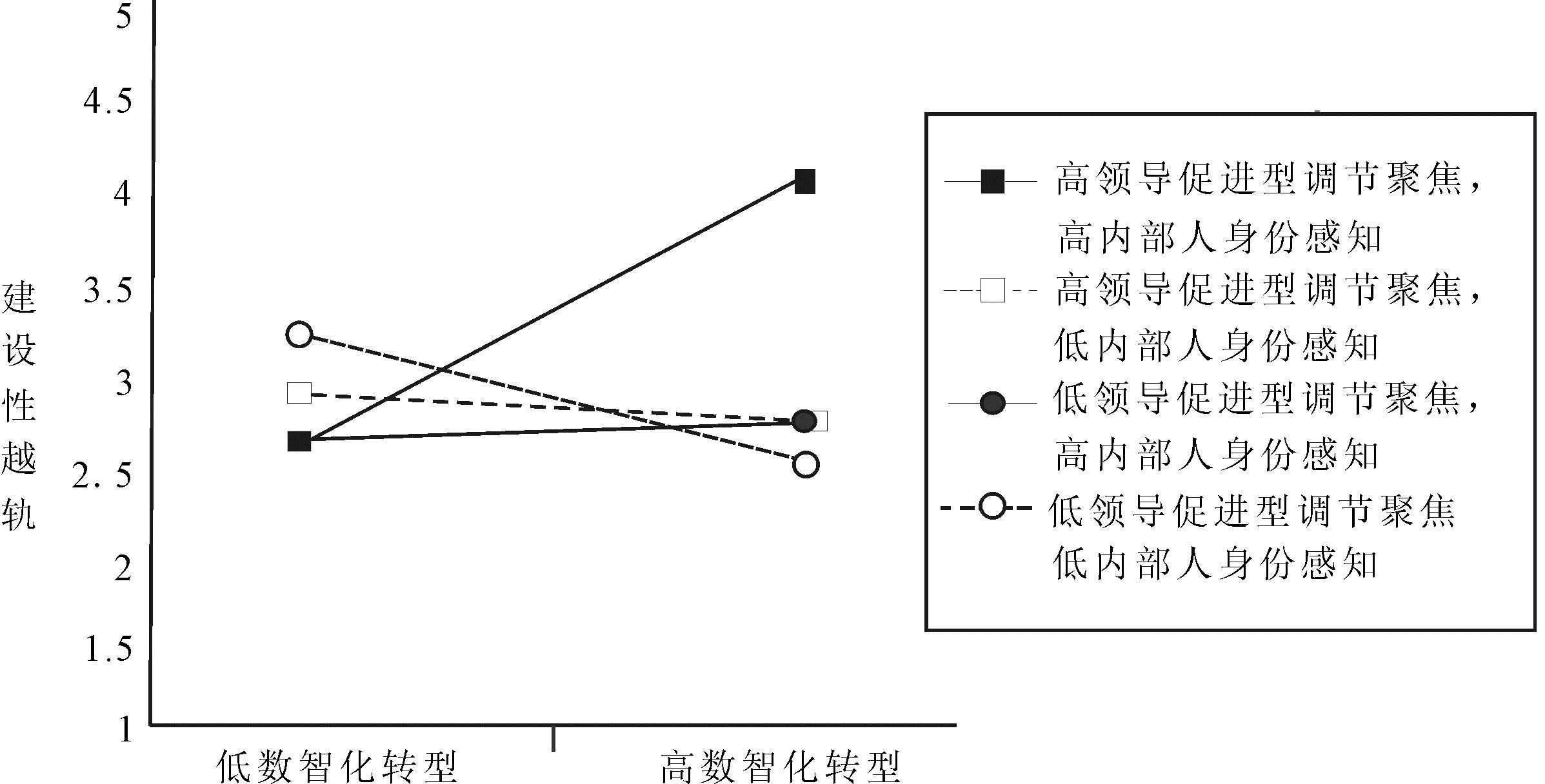 促进型调节聚焦领导肯定员工价值并鼓励追求成功与理想,有助于降低员工越轨行为风险。此时,员工组织认同感与归属感得到增强,具备高水平内部人身份感知的员工更倾向于与领导建立积极的互动纽带,将组织目标与个人目标相结合,进而为组织发展去探索创新性解决方案(李燕萍等,2017)。此外,在促进型调节聚焦领导情境下,开放、创新和包容的工作氛围有助于员工自由阐述个人见解,能够与上级或同事展开良好沟通,减轻潜在人际矛盾的顾虑。相比于低内部人身份感知,高内部人身份感知员工认为自己拥有更丰富的数智化转型带来的异质性资源,且得到组织和领导支持,自我效能感进一步强化,更敢于开展建设性越轨行为。