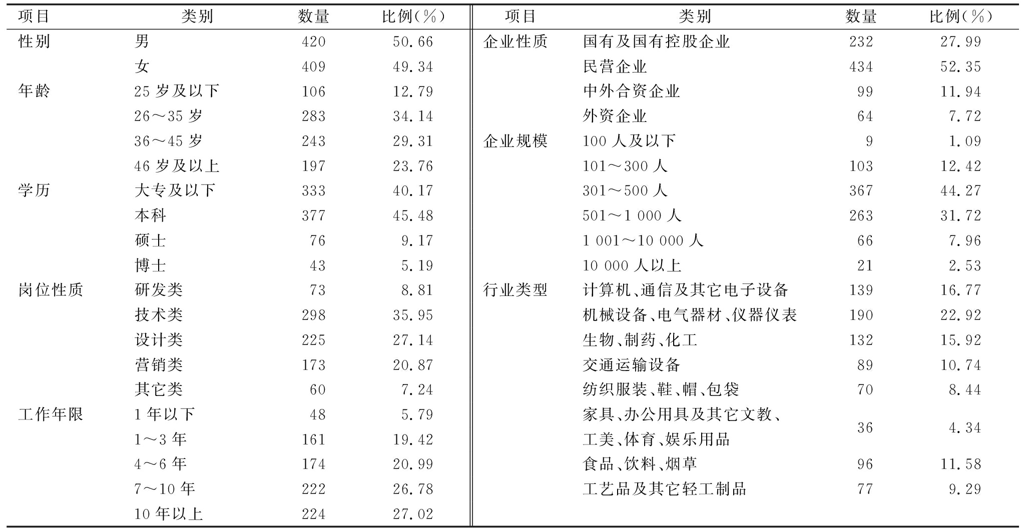 (5)控制变量:借鉴相关研究[26,34],本文将员工层面的性别、学历、年龄、工作年限、岗位性质以及企业层面的企业性质、企业规模和行业类型作为控制变量。样本特征见表1。