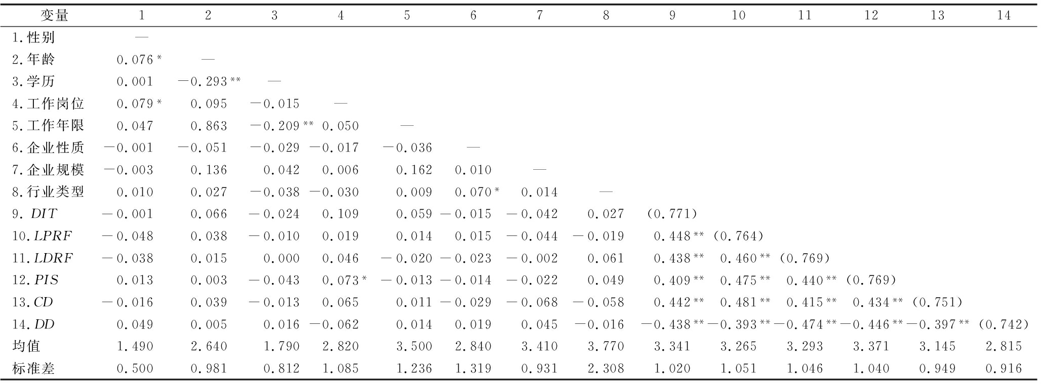 变量12345678910111213141.性别—2.年龄0.076*—3.学历0.001-0.293**—4.工作岗位0.079*0.095-0.015—5.工作年限0.0470.863-0.209**0.050—6.企业性质-0.001-0.051-0.029-0.017-0.036—7.企业规模-0.0030.1360.0420.0060.1620.010—8.行业类型0.0100.027-0.038-0.0300.0090.070*0.014—9.DIT-0.0010.066-0.0240.1090.059-0.015-0.0420.027(0.771)10.LPRF-0.0480.038-0.0100.0190.0140.015-0.044-0.0190.448**(0.764)11.LDRF-0.0380.0150.0000.046-0.020-0.023-0.0020.0610.438**0.460**(0.769)12.PIS0.0130.003-0.0430.073*-0.013-0.014-0.0220.0490.409**0.475**0.440**(0.769)13.CD-0.0160.039-0.0130.0650.011-0.029-0.068-0.0580.442**0.481**0.415**0.434**(0.751)14.DD0.0490.0050.016-0.0620.0140.0190.045-0.016-0.438**-0.393**-0.474**-0.446**-0.397**(0.742)均值1.4902.6401.7902.8203.5002.8403.4103.7703.3413.2653.2933.3713.1452.815标准差0.5000.9810.8121.0851.2361.3190.9312.3081.0201.0511.0461.0400.9490.916