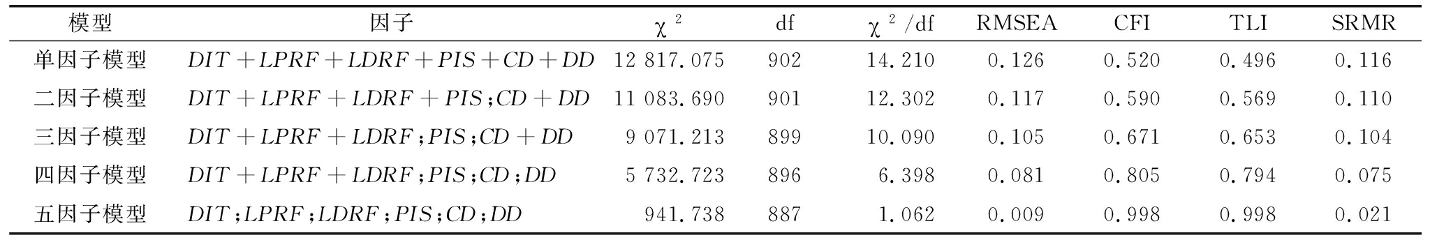 模型因子χ2dfχ2/dfRMSEACFITLISRMR单因子模型DIT+LPRF+LDRF+PIS+CD+DD12817.07590214.2100.1260.5200.4960.116二因子模型DIT+LPRF+LDRF+PIS;CD+DD11083.69090112.3020.1170.5900.5690.110三因子模型DIT+LPRF+LDRF;PIS;CD+DD9071.21389910.0900.1050.6710.6530.104四因子模型DIT+LPRF+LDRF;PIS;CD;DD5732.7238966.3980.0810.8050.7940.075五因子模型DIT;LPRF;LDRF;PIS;CD;DD941.7388871.0620.0090.9980.9980.021