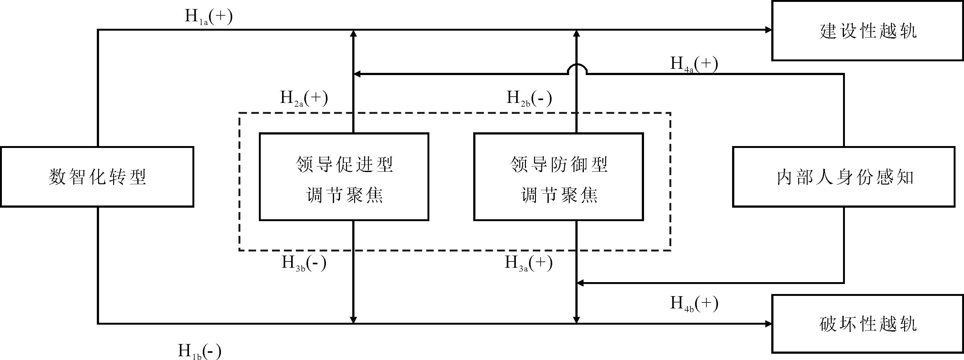 综上,为了深度剖析制造企业数智化转型对两类员工越轨行为的影响机理,本研究基于行为决策理论、威胁刚性理论以及调节聚焦理论,探讨数智化转型对两类越轨行为的影响机制,并考察数智化转型、领导促进型/防御型调节聚焦和内部人身份感知三者交互对两类越轨行为的作用效应,以期丰富数智化转型和越轨行为研究,为企业人力资源管理和数智化转型实践提供有益思路。