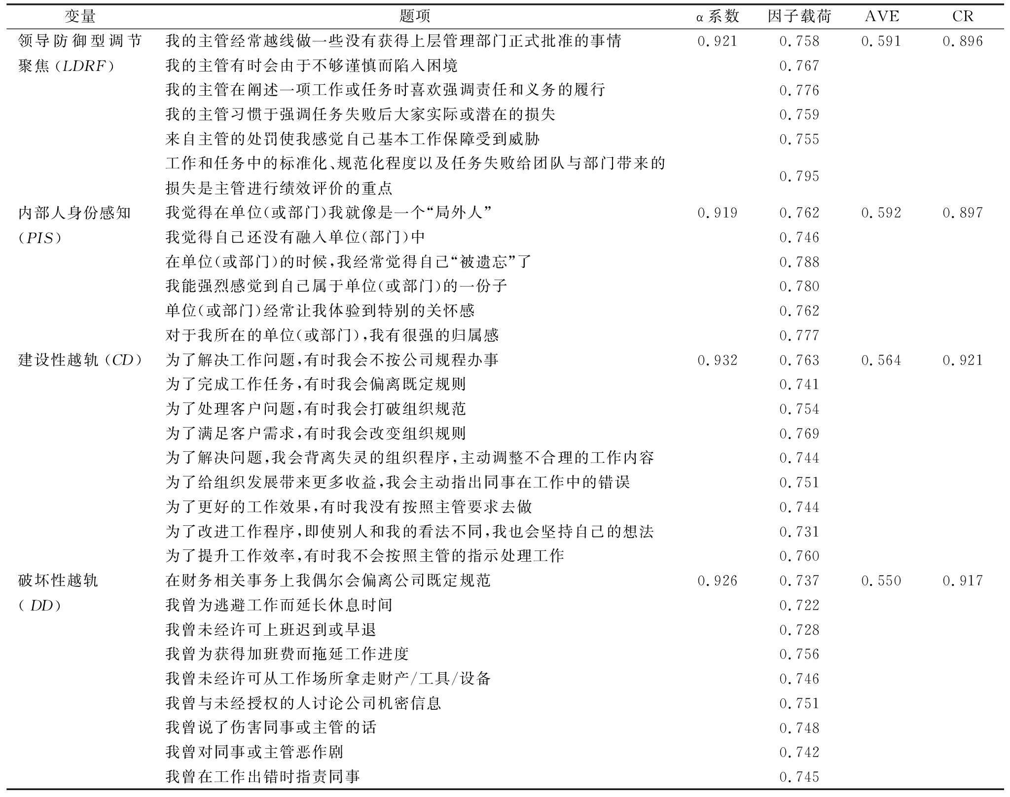 变量题项α系数因子载荷AVECR领导防御型调节聚焦(LDRF)我的主管经常越线做一些没有获得上层管理部门正式批准的事情0.9210.7580.5910.896我的主管有时会由于不够谨慎而陷入困境0.767我的主管在阐述一项工作或任务时喜欢强调责任和义务的履行0.776我的主管习惯于强调任务失败后大家实际或潜在的损失0.759来自主管的处罚使我感觉自己基本工作保障受到威胁0.755工作和任务中的标准化、规范化程度以及任务失败给团队与部门带来的损失是主管进行绩效评价的重点0.795内部人身份感知(PIS)我觉得在单位(或部门)我就像是一个“局外人”0.9190.7620.5920.897我觉得自己还没有融入单位(部门)中0.746在单位(或部门)的时候,我经常觉得自己“被遗忘”了0.788我能强烈感觉到自己属于单位(或部门)的一份子0.780单位(或部门)经常让我体验到特别的关怀感0.762对于我所在的单位(或部门),我有很强的归属感0.777建设性越轨(CD)为了解决工作问题,有时我会不按公司规程办事0.9320.7630.5640.921为了完成工作任务,有时我会偏离既定规则0.741为了处理客户问题,有时我会打破组织规范0.754为了满足客户需求,有时我会改变组织规则0.769为了解决问题,我会背离失灵的组织程序,主动调整不合理的工作内容0.744为了给组织发展带来更多收益,我会主动指出同事在工作中的错误0.751为了更好的工作效果,有时我没有按照主管要求去做0.744为了改进工作程序,即使别人和我的看法不同,我也会坚持自己的想法0.731为了提升工作效率,有时我不会按照主管的指示处理工作0.760破坏性越轨(DD)在财务相关事务上我偶尔会偏离公司既定规范0.9260.7370.5500.917我曾为逃避工作而延长休息时间0.722我曾未经许可上班迟到或早退0.728我曾为获得加班费而拖延工作进度0.756我曾未经许可从工作场所拿走财产/工具/设备0.746我曾与未经授权的人讨论公司机密信息0.751我曾说了伤害同事或主管的话0.748我曾对同事或主管恶作剧0.742我曾在工作出错时指责同事0.745