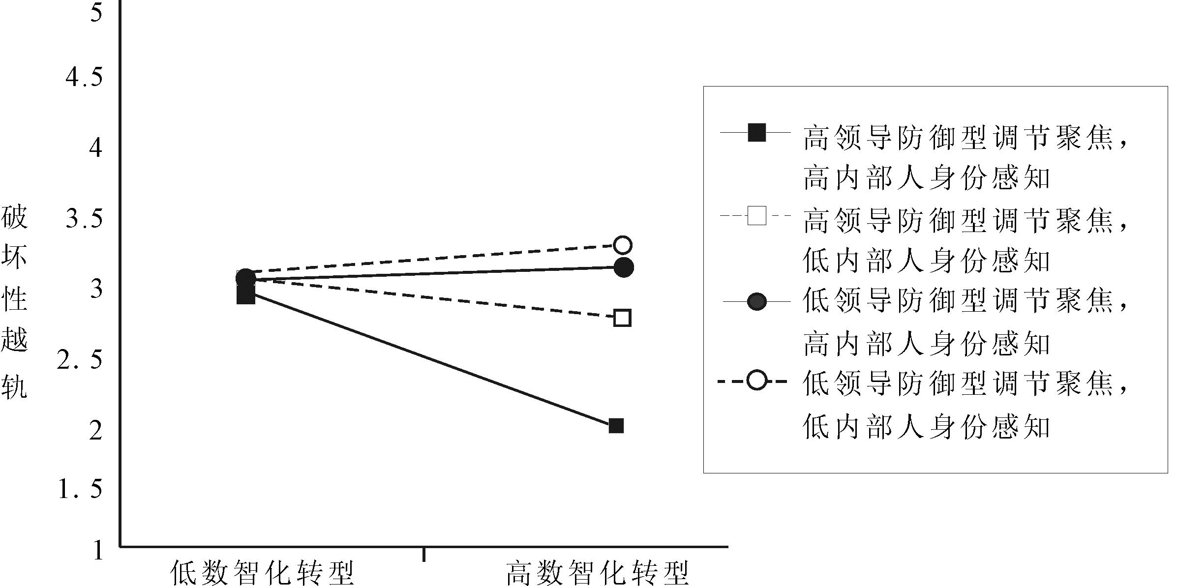 (3)数智化转型、领导促进型调节聚焦和内部人身份感知三者交互显著正向影响建设性越轨行为,数智化转型、领导防御型调节聚焦和内部人身份感知三者交互显著负向影响破坏性越轨行为。面对促进型调节聚焦领导,数智化转型对高内部人身份感知员工建设性越轨的影响更显著,这是因为此类领导更能够激励员工发挥创造力,鼓励其利用现有资源进行创新,加之作为高“内部人”身份感知的员工具有建设性责任知觉,更倾向于实施建设性越轨以提升组织和个人获益。当面对防御型调节聚焦领导时,数智化转型对高内部人身份感知员工破坏性越轨行为的影响更显著,这是因为该类领导易使员工产生约束感,同时,高内部人身份感知员工具有更强烈的组织认同感,在数智化技术的监管下有助于进一步减少破坏性越轨发生。