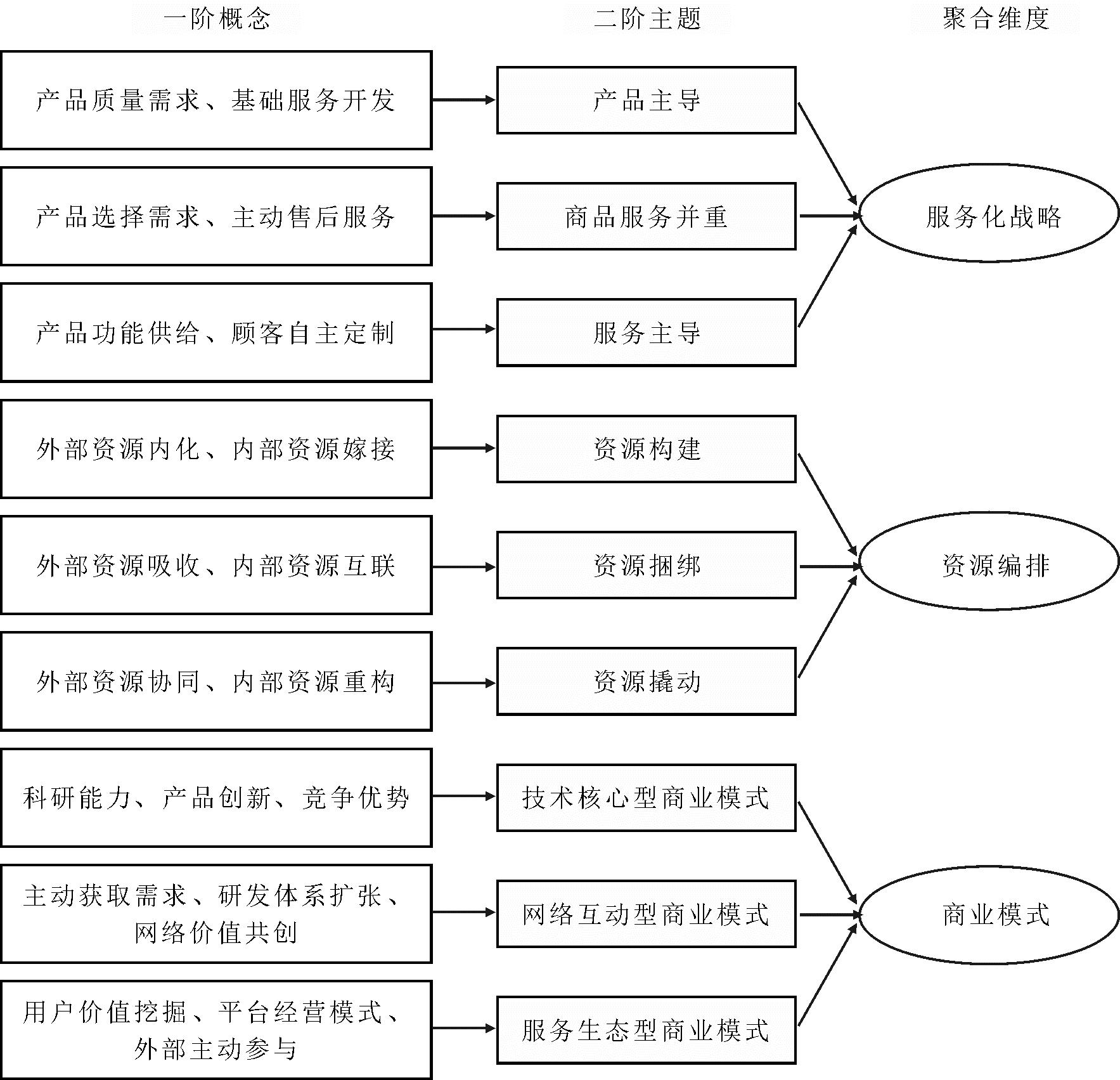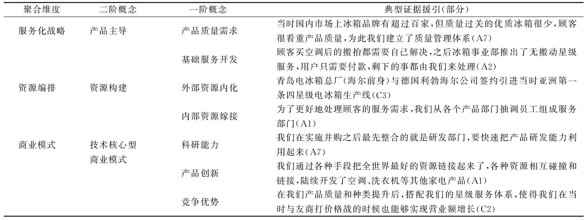 聚合维度二阶概念 一阶概念 典型证据援引(部分)服务化战略产品主导产品质量需求当时国内市场上冰箱品牌有超过百家,但质量过关的优质冰箱很少,顾客很看重产品质量,为此我们建立了质量管理体系(A7)基础服务开发顾客买空调后的搬抬都需要自己解决,之后冰箱事业部推出了无搬动星级服务,用户只需要付款,剩下的事都由我们来处理(A2)资源编排 资源构建外部资源内化青岛电冰箱总厂(海尔前身)与德国利勃海尔公司签约引进当时亚洲第一条四星级电冰箱生产线(C3)内部资源嫁接为了更好地处理顾客的服务需求,我们从各个产品部门抽调员工组成服务部门(A1)商业模式 技术核心型商业模式科研能力我们在实施并购之后最先整合的就是研发部门,要快速把产品研发能力利用起来(A7)产品创新我们通过各种手段把全世界最好的资源链接起来了,各种资源相互碰撞和链接,陆续开发了空调、洗衣机等其他家电产品(A1)竞争优势在我们产品质量和种类提升后,搭配我们的星级服务体系,使得我们在当时与友商打价格战的时候也能够实现营业额增长(C2)