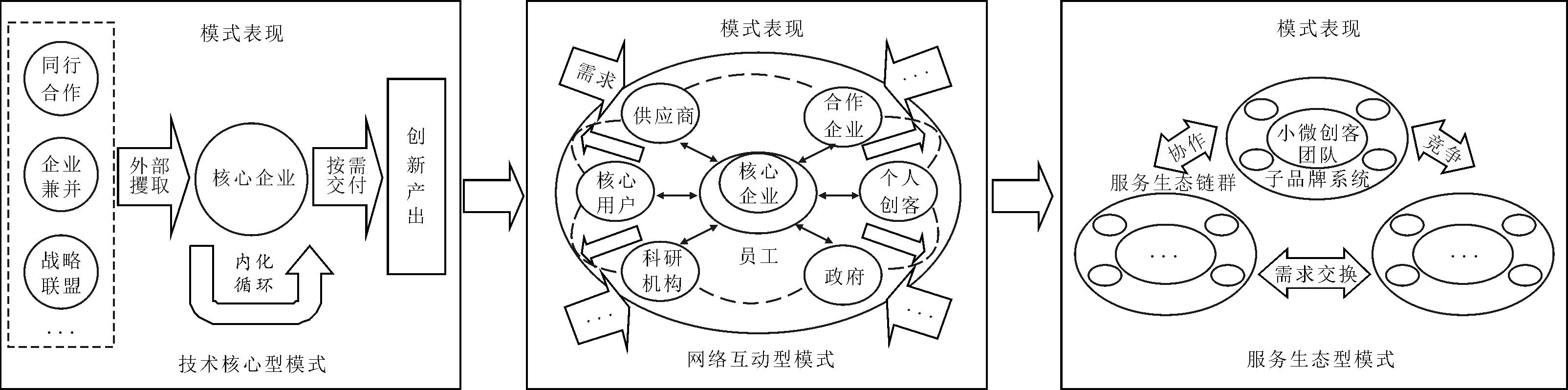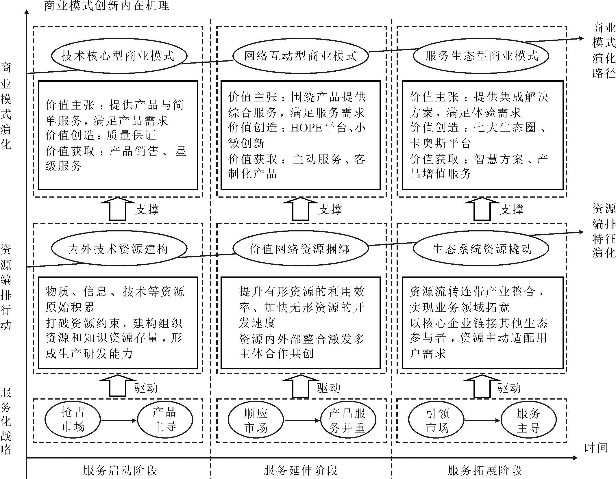 海尔商业模式在服务化进程中存在着显著的演化:在服务启动阶段,市场对家电产品的旺盛需求主导了企业的研发与制造业务,以技术为核心的资源编排是此阶段主题,有效的技术资源编排使海尔形成了技术核心型商业模式。随着市场对服务需求的增加,海尔进入服务延伸阶段,逐步强化服务导向,主张通过服务增加产品效能。企业同内外部主体的互动程度提升,借助纳入多元主体实现资源利用。企业的盈利模式发生变化,组织运作结构逐渐演化为依托价值网络形成的互动型商业模式。在服务拓展阶段,由于高效率的资源编排行动打通了企业与生态参与者之间的价值交换进程,服务开发效率加快,以顾客需求为重心的价值主张催生了基于互联网驱动的服务生态系统,最终企业逐渐转向服务生态型商业模式。最后形成了“技术核心型商业模式—网络互动型商业模式—服务生态型商业模式”的创新演化路径(如图4所示)。
