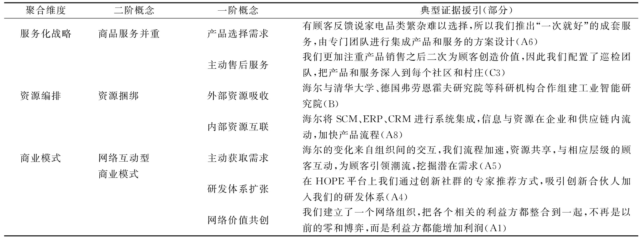 聚合维度二阶概念一阶概念典型证据援引(部分)服务化战略商品服务并重产品选择需求有顾客反馈说家电品类繁杂难以选择,所以我们推出“一次就好”的成套服务,由专门团队进行集成产品和服务的方案设计(A6)主动售后服务我们更加注重产品销售之后二次为顾客创造价值,因此我们配置了巡检团队,把产品和服务深入到每个社区和村庄(C3)资源编排 资源捆绑外部资源吸收海尔与清华大学、德国弗劳恩霍夫研究院等科研机构合作组建工业智能研究院(B)内部资源互联海尔将SCM、ERP、CRM进行系统集成,信息与资源在企业和供应链内流动,加快产品流程(A8)商业模式 网络互动型商业模式主动获取需求海尔的变化来自组织间的交互,我们流程加速,资源共享,与相应层级的顾客互动,为顾客引领潮流,挖掘潜在需求(A5)研发体系扩张在HOPE平台上我们通过创新社群的专家推荐方式,吸引创新合伙人加入我们的研发体系(A4)网络价值共创我们建立了一个网络组织,把各个相关的利益方都整合到一起,不再是以前的零和博弈,而是利益方都能增加利润(A1)