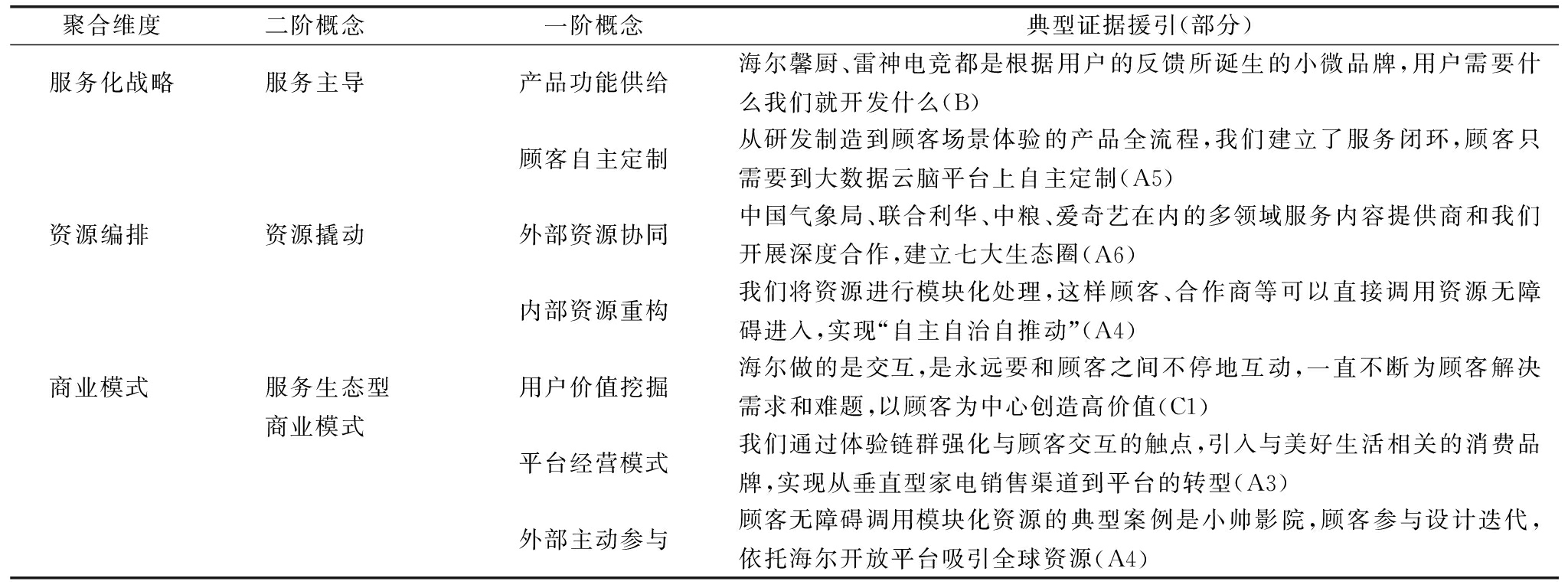 聚合维度二阶概念 一阶概念典型证据援引(部分)服务化战略服务主导产品功能供给海尔馨厨、雷神电竞都是根据用户的反馈所诞生的小微品牌,用户需要什么我们就开发什么(B)顾客自主定制从研发制造到顾客场景体验的产品全流程,我们建立了服务闭环,顾客只需要到大数据云脑平台上自主定制(A5)资源编排 资源撬动外部资源协同中国气象局、联合利华、中粮、爱奇艺在内的多领域服务内容提供商和我们开展深度合作,建立七大生态圈(A6)内部资源重构我们将资源进行模块化处理,这样顾客、合作商等可以直接调用资源无障碍进入,实现“自主自治自推动”(A4)商业模式 服务生态型商业模式用户价值挖掘海尔做的是交互,是永远要和顾客之间不停地互动,一直不断为顾客解决需求和难题,以顾客为中心创造高价值(C1)平台经营模式我们通过体验链群强化与顾客交互的触点,引入与美好生活相关的消费品牌,实现从垂直型家电销售渠道到平台的转型(A3)外部主动参与顾客无障碍调用模块化资源的典型案例是小帅影院,顾客参与设计迭代,依托海尔开放平台吸引全球资源(A4)