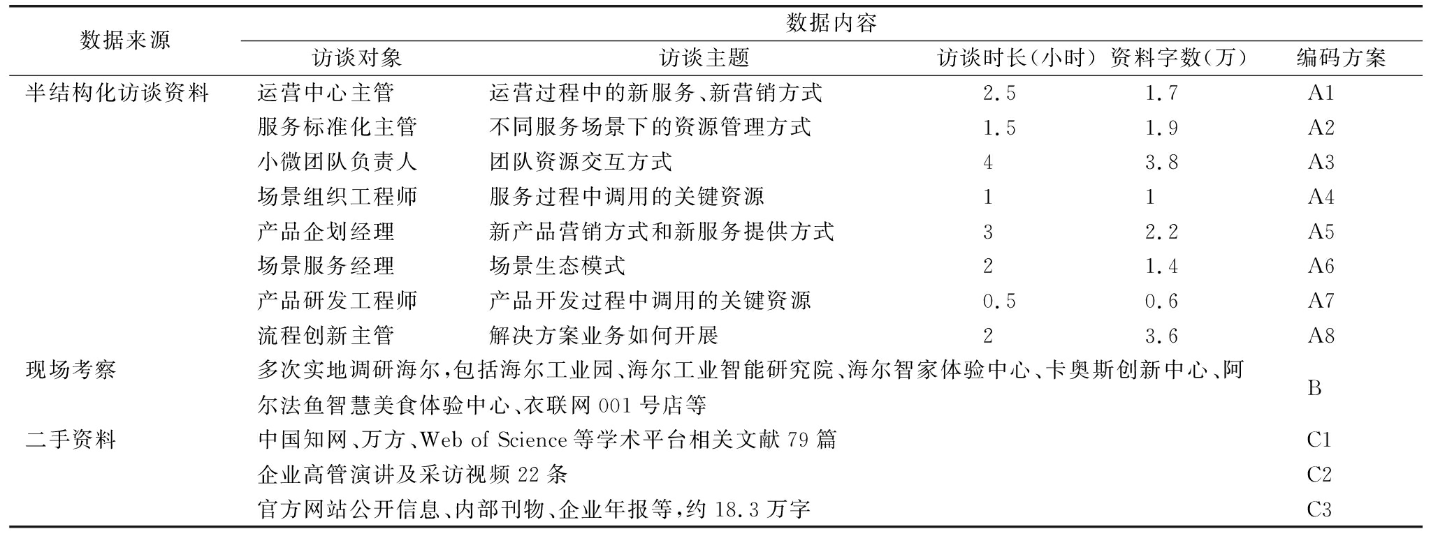 数据来源数据内容访谈对象访谈主题访谈时长(小时)资料字数(万)编码方案半结构化访谈资料运营中心主管运营过程中的新服务、新营销方式2.51.7A1服务标准化主管不同服务场景下的资源管理方式1.51.9A2小微团队负责人团队资源交互方式43.8A3场景组织工程师服务过程中调用的关键资源11A4产品企划经理新产品营销方式和新服务提供方式32.2A5场景服务经理场景生态模式21.4A6产品研发工程师产品开发过程中调用的关键资源0.50.6A7流程创新主管解决方案业务如何开展23.6A8现场考察多次实地调研海尔,包括海尔工业园、海尔工业智能研究院、海尔智家体验中心、卡奥斯创新中心、阿尔法鱼智慧美食体验中心、衣联网001号店等B二手资料中国知网、万方、WebofScience等学术平台相关文献79篇C1企业高管演讲及采访视频22条C2官方网站公开信息、内部刊物、企业年报等,约18.3万字C3