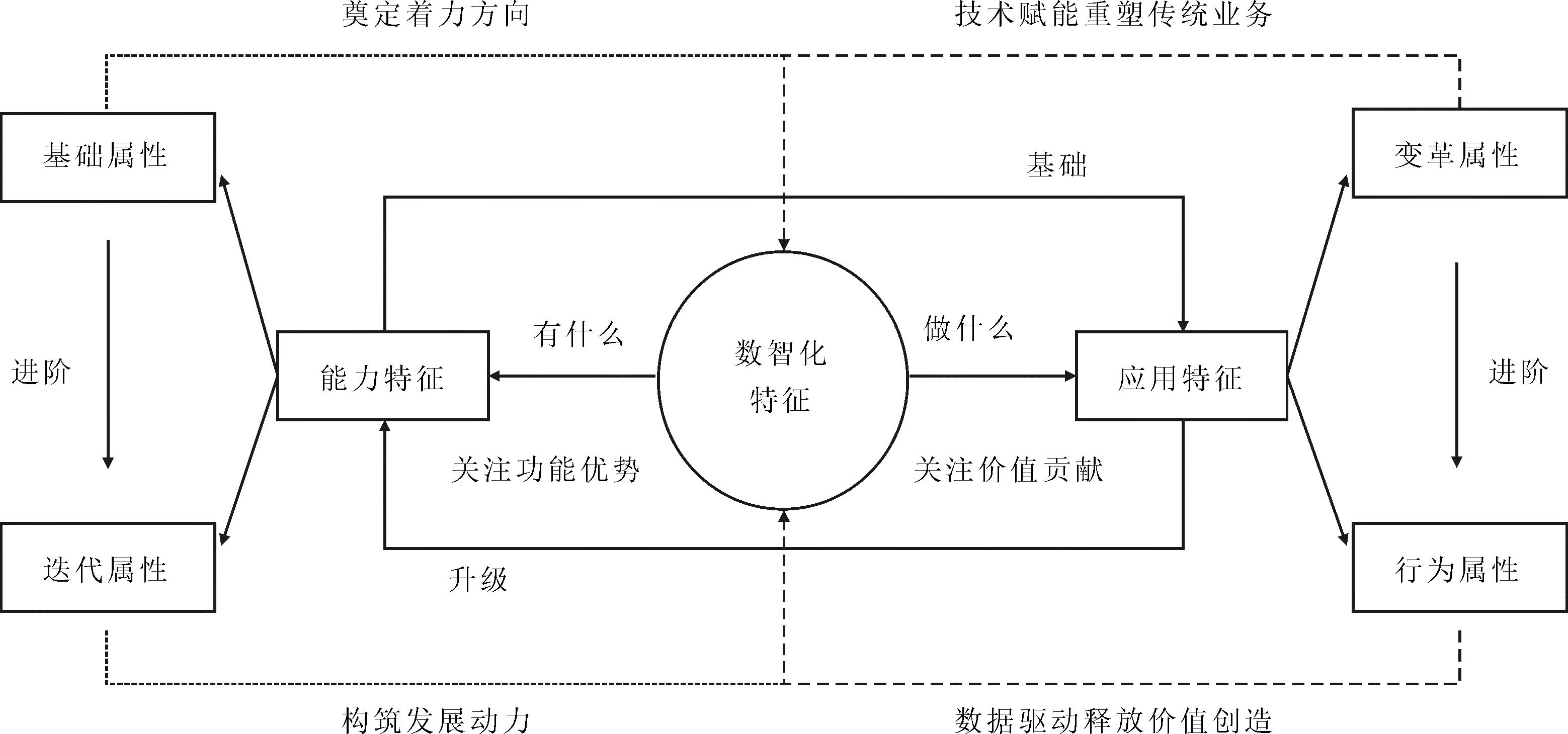 对于数智化特征,在理解内涵的基础上,本文借鉴相关研究提出的信息系统“造”与“用”的思想(陈国青等,2022),从特征表现(能力特征和应用特征)与属性维度(基础属性、迭代属性、变革属性和行为属性)进行识别,旨在厘清数智化发展特征内容以及不同特征之间的关系,建立对数智化作为发展基础影响管理者行为的功能优势的理解,如图3所示。