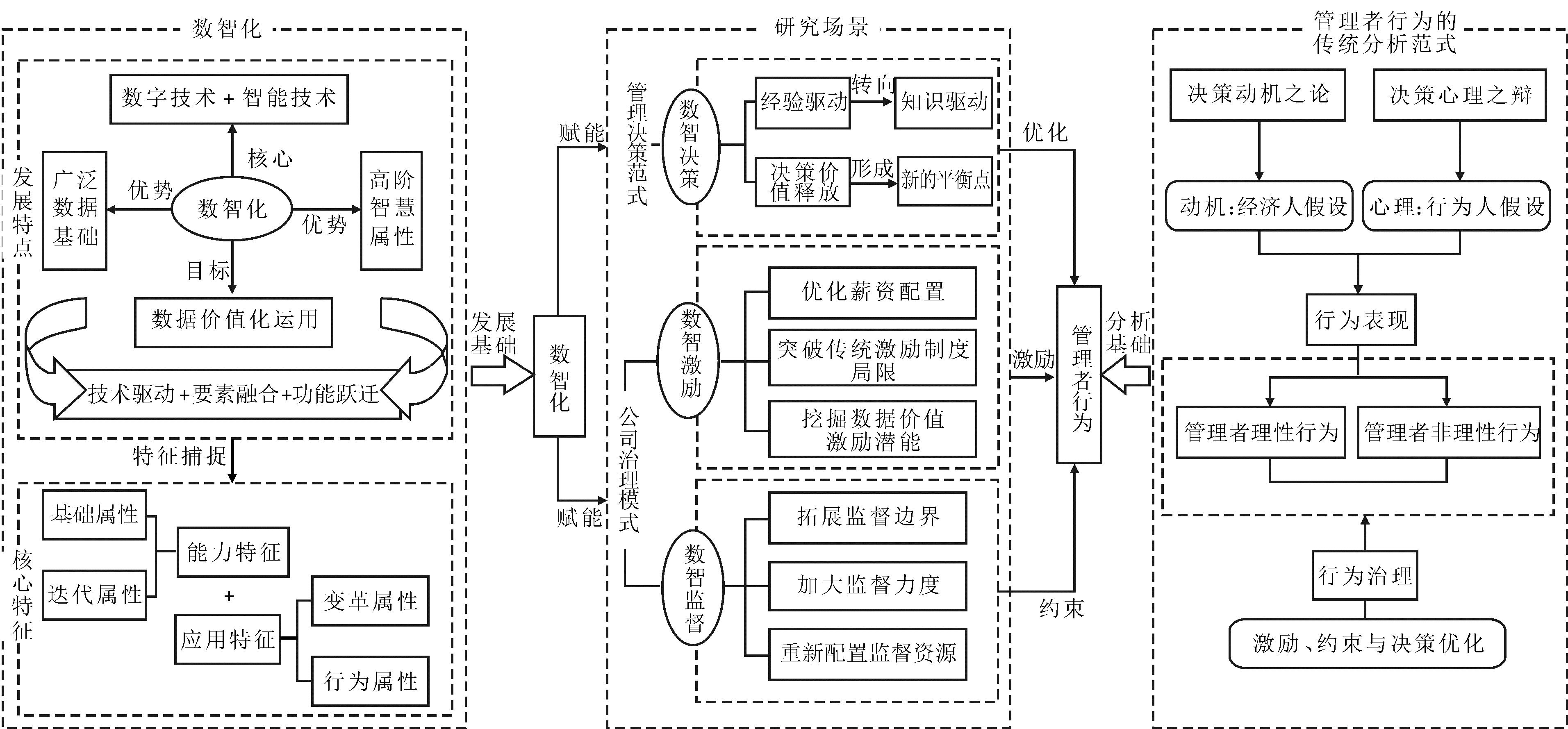 近年来,伴随算法治理、人机交互、机器学习等数智理念的问世,数智化在提高企业运作效率、优化管理决策等方面的效能引起学术界的高度关注。现代企业制度下,两权分离的企业组织形式衍生出委托代理和信息不对称等问题一定程度上制约组织效能。作为企业的掌舵者,管理者行为深刻影响企业决策。尤其在集权式决策结构中,管理者往往对企业财务战略具有主导性影响力[1],其行为直接影响企业经济发展。然而,一方面,由于自利的天性使然,管理者往往会基于切身利益、个人声誉、未来发展等考虑,表现出操纵、迎合、遮掩等行为倾向(谢获宝等,2014;孙晓华等,2023;王剑等,2020);另一方面,受困于自身心理、偏好、信念等特征影响,管理者行为具有鲜明的个人主义色彩,如过度自信、短视主义、谦卑等(刘柏和梁超,2016;Ladika等,2020;Zhang等,2017),使得企业各项决策也具有管理者行为风格。因此,无论是管理者“利己”的行为动机,还是非理性的行为心理,都可能使决策结果偏离最优状态,造成资源配置损失。如何通过一系列机制设计和制度安排,优化管理者行为、提高资本管理质量一直是学者们关注的重点。数智化时代的到来为管理者行为研究注入新活力,也为决策过程中的难题解决提供新契机。区别于传统变革,数智化时代充分展现数智技术新特征,并释放出强大的外部效应。在数智化时代,一方面,技术变革重塑管理决策过程和方式,传统决策范式已然发生变化[2];另一方面,数智化发展孕育新业态和新模式,有助于企业治理结构迭代升级和治理机制优化,形成新治理生态(陈德球等,2022)。数智化背景下面对决策环境与治理环境变化,管理者行为是否呈现新面貌?新决策范式和传统公司治理新实践的涌现是否以及如何影响管理者行为?对这些问题的解答具有重要的理论意义与实践价值。