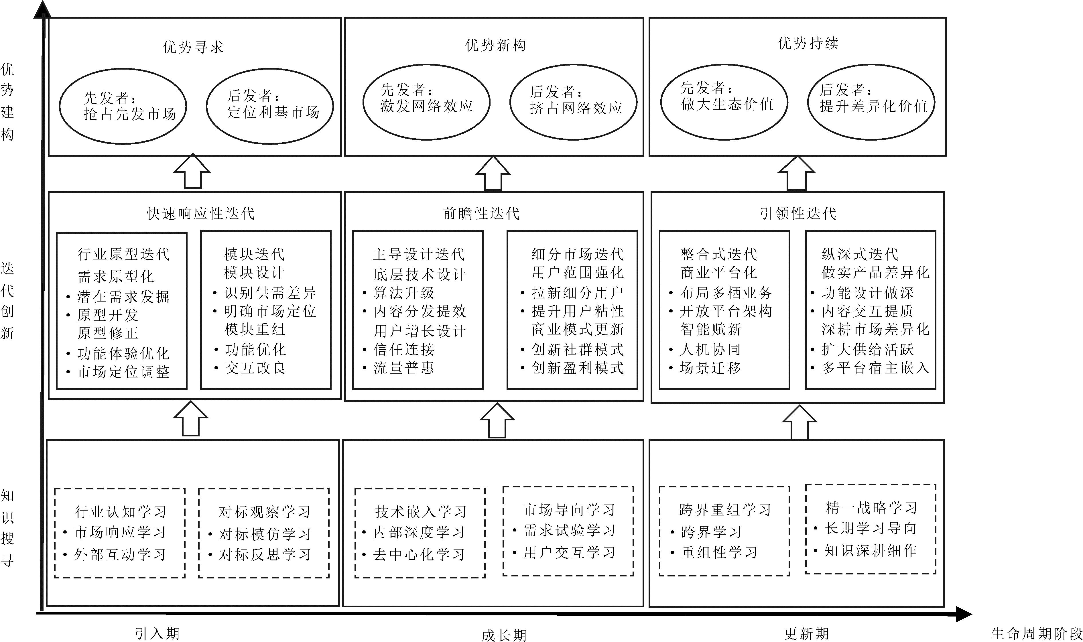 在引入期,由于在市场和技术方面的经验知识不足,企业在做中学习的动力较强,能够根据技术和市场反馈快速调整,完成对产品知识的初步验证。例如,技术方向的功能响应优化包括问题修复、性能优化、参数更新、模块化(重组、修改、删减)等;市场方向的体验响应优化包括流程优化、界面设计优化、运营交互逻辑调整等。因此,企业在引入期以快速响应性迭代为主,最终实现优势寻求。在成长期,企业已积累一定经验知识,为实现用户规模增长,通过增强核心技术功能或创新市场手段开发产品知识十分关键。例如,技术方向的底层技术设计包括开发新算法、引入新技术模型等;市场方向的用户市场创新包括新增运营活动、更新商业模式等。因此,企业在成长期以前瞻性迭代为主,最终实现优势新构。在更新期,企业进一步巩固市场竞争格局,加快新知识体系整合和价值溢出,在焦点领域发挥对技术和市场发展的引领作用。例如,技术方向的颠覆引领包括衍生新功能(人工智能助手、互动对话、文本创作等)、新端口(跨平台进入端口等)、新架构(开放平台架构等);市场方向的价值共创包括拓展多元业务场景、实现开放生态合作等。因此,企业在更新期以引领性迭代为主,最终实现优势持续。从快速响应性迭代、前瞻性迭代到引领性迭代,数字原生企业在技术和市场方向的迭代演化逐渐深入。综上,本文提出如下命题: