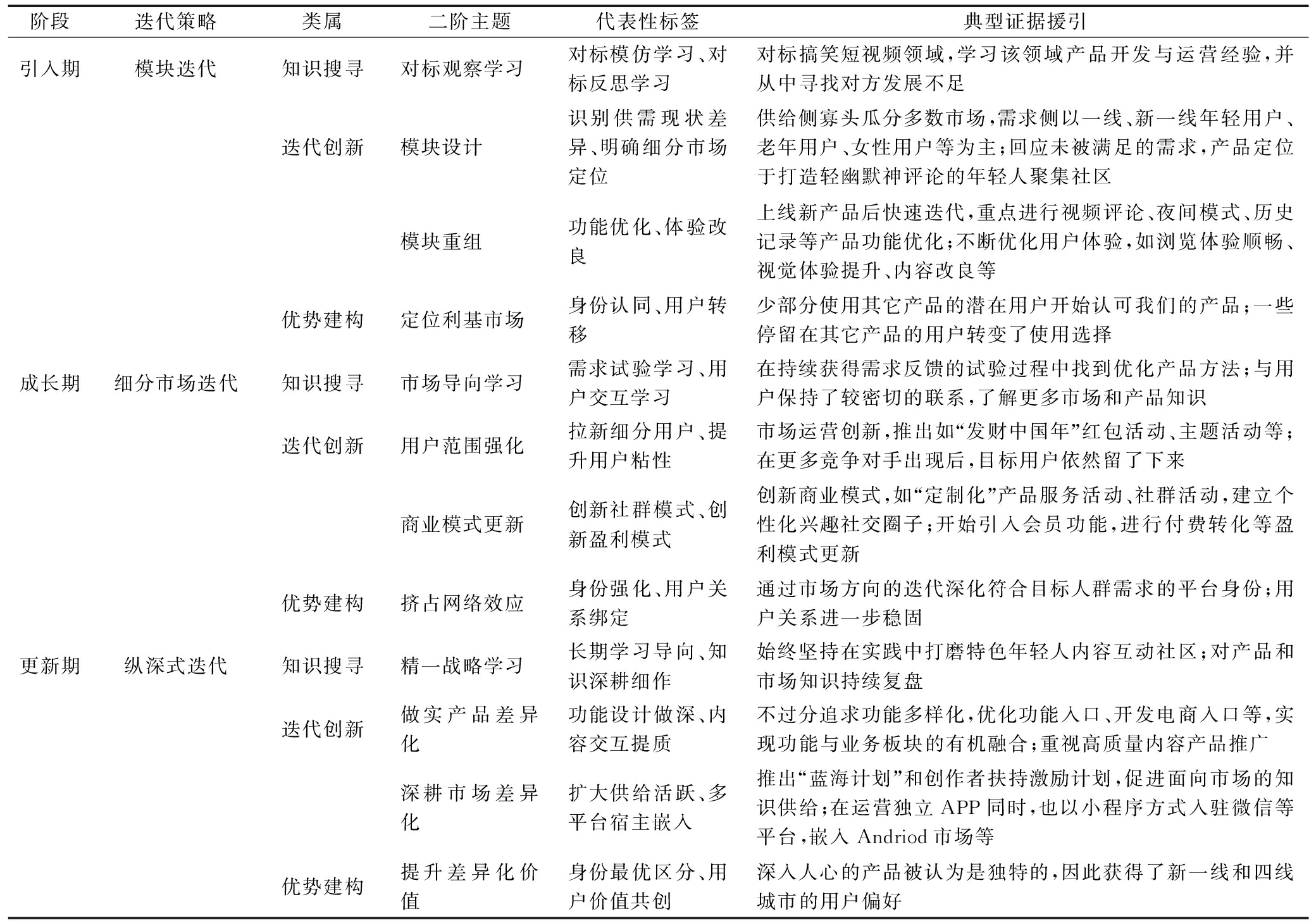 阶段迭代策略类属二阶主题代表性标签典型证据援引引入期模块迭代知识搜寻对标观察学习对标模仿学习、对标反思学习对标搞笑短视频领域,学习该领域产品开发与运营经验,并从中寻找对方发展不足迭代创新模块设计识别供需现状差异、明确细分市场定位供给侧寡头瓜分多数市场,需求侧以一线、新一线年轻用户、老年用户、女性用户等为主;回应未被满足的需求,产品定位于打造轻幽默神评论的年轻人聚集社区模块重组功能优化、体验改良上线新产品后快速迭代,重点进行视频评论、夜间模式、历史记录等产品功能优化;不断优化用户体验,如浏览体验顺畅、视觉体验提升、内容改良等优势建构定位利基市场身份认同、用户转移少部分使用其它产品的潜在用户开始认可我们的产品;一些停留在其它产品的用户转变了使用选择成长期细分市场迭代知识搜寻市场导向学习需求试验学习、用户交互学习在持续获得需求反馈的试验过程中找到优化产品方法;与用户保持了较密切的联系,了解更多市场和产品知识迭代创新用户范围强化拉新细分用户、提升用户粘性市场运营创新,推出如“发财中国年”红包活动、主题活动等;在更多竞争对手出现后,目标用户依然留了下来商业模式更新创新社群模式、创新盈利模式创新商业模式,如“定制化”产品服务活动、社群活动,建立个性化兴趣社交圈子;开始引入会员功能,进行付费转化等盈利模式更新优势建构挤占网络效应身份强化、用户关系绑定通过市场方向的迭代深化符合目标人群需求的平台身份;用户关系进一步稳固更新期纵深式迭代知识搜寻精一战略学习长期学习导向、知识深耕细作始终坚持在实践中打磨特色年轻人内容互动社区;对产品和市场知识持续复盘迭代创新做实产品差异化功能设计做深、内容交互提质不过分追求功能多样化,优化功能入口、开发电商入口等,实现功能与业务板块的有机融合;重视高质量内容产品推广深耕市场差异化扩大供给活跃、多平台宿主嵌入推出“蓝海计划”和创作者扶持激励计划,促进面向市场的知识供给;在运营独立APP同时,也以小程序方式入驻微信等平台,嵌入Andriod市场等优势建构提升差异化价值身份最优区分、用户价值共创深入人心的产品被认为是独特的,因此获得了新一线和四线城市的用户偏好