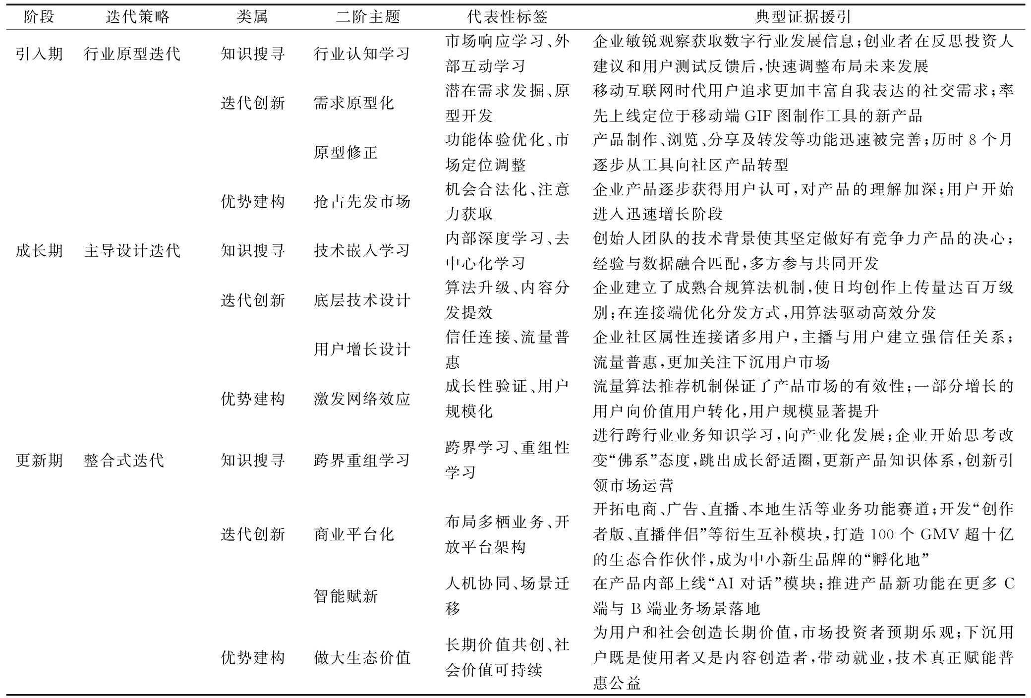 阶段迭代策略类属二阶主题代表性标签典型证据援引引入期行业原型迭代知识搜寻行业认知学习市场响应学习、外部互动学习企业敏锐观察获取数字行业发展信息;创业者在反思投资人建议和用户测试反馈后,快速调整布局未来发展迭代创新需求原型化潜在需求发掘、原型开发移动互联网时代用户追求更加丰富自我表达的社交需求;率先上线定位于移动端GIF图制作工具的新产品原型修正功能体验优化、市场定位调整产品制作、浏览、分享及转发等功能迅速被完善;历时8个月逐步从工具向社区产品转型优势建构抢占先发市场机会合法化、注意力获取企业产品逐步获得用户认可,对产品的理解加深;用户开始进入迅速增长阶段成长期主导设计迭代知识搜寻技术嵌入学习内部深度学习、去中心化学习创始人团队的技术背景使其坚定做好有竞争力产品的决心;经验与数据融合匹配,多方参与共同开发迭代创新底层技术设计算法升级、内容分发提效企业建立了成熟合规算法机制,使日均创作上传量达百万级别;在连接端优化分发方式,用算法驱动高效分发用户增长设计信任连接、流量普惠企业社区属性连接诸多用户,主播与用户建立强信任关系;流量普惠,更加关注下沉用户市场优势建构激发网络效应成长性验证、用户规模化流量算法推荐机制保证了产品市场的有效性;一部分增长的用户向价值用户转化,用户规模显著提升更新期整合式迭代知识搜寻跨界重组学习跨界学习、重组性学习进行跨行业业务知识学习,向产业化发展;企业开始思考改变“佛系”态度,跳出成长舒适圈,更新产品知识体系,创新引领市场运营迭代创新商业平台化布局多栖业务、开放平台架构开拓电商、广告、直播、本地生活等业务功能赛道;开发“创作者版、直播伴侣”等衍生互补模块,打造100个GMV超十亿的生态合作伙伴,成为中小新生品牌的“孵化地”智能赋新人机协同、场景迁移在产品内部上线“AI 对话”模块;推进产品新功能在更多 C 端与 B 端业务场景落地优势建构做大生态价值长期价值共创、社会价值可持续为用户和社会创造长期价值,市场投资者预期乐观;下沉用户既是使用者又是内容创造者,带动就业,技术真正赋能普惠公益