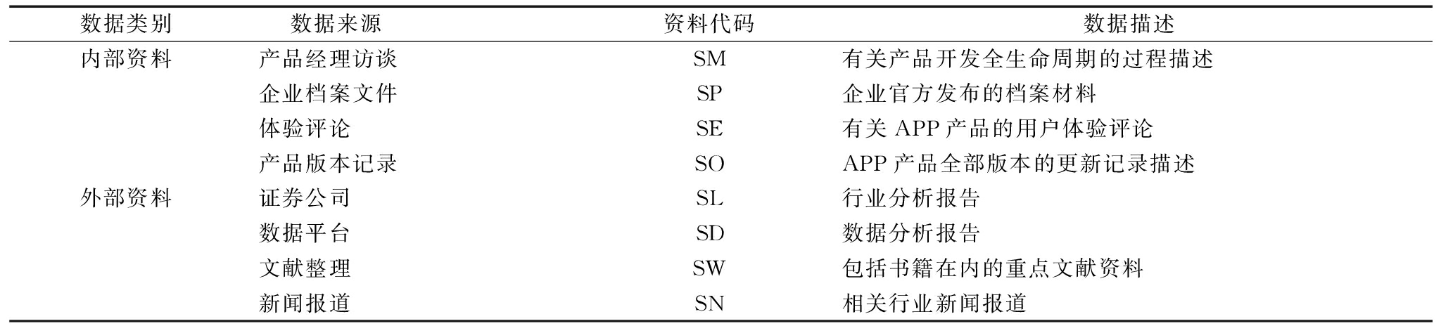 数据类别数据来源资料代码数据描述内部资料产品经理访谈SM有关产品开发全生命周期的过程描述企业档案文件SP企业官方发布的档案材料体验评论SE有关APP产品的用户体验评论产品版本记录SOAPP产品全部版本的更新记录描述外部资料证券公司SL行业分析报告数据平台SD数据分析报告文献整理SW包括书籍在内的重点文献资料新闻报道SN相关行业新闻报道