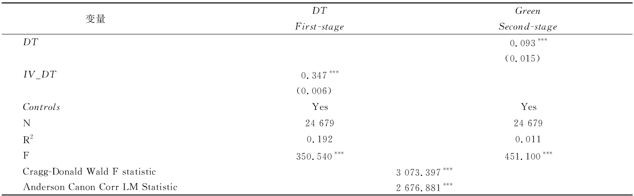 变量DTGreenFirst-stageSecond-stageDT0.093***(0.015)IV_DT0.347***(0.006)ControlsYesYesN24 67924 679R20.1920.011F350.540***451.100***Cragg-Donald Wald F statistic3 073.397***Anderson Canon Corr LM Statistic2 676.881***
