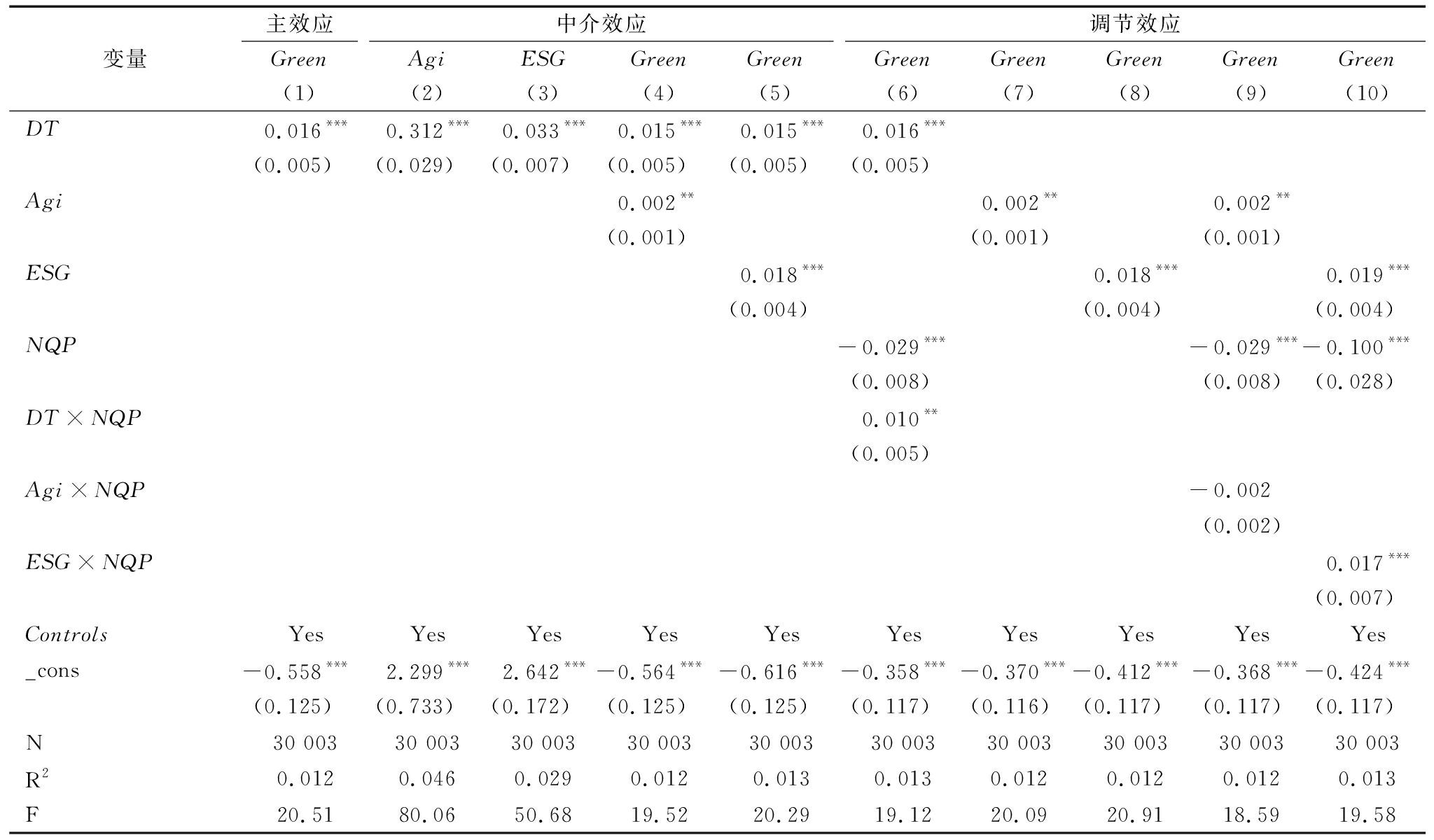 变量主效应Green(1)中介效应AgiESGGreenGreen(2)(3)(4)(5)调节效应GreenGreenGreenGreenGreen(6)(7)(8)(9)(10)DT0.016***0.312***0.033***0.015***0.015***0.016***(0.005)(0.029)(0.007)(0.005)(0.005)(0.005)Agi0.002**0.002**0.002**(0.001)(0.001)(0.001)ESG0.018***0.018***0.019***(0.004)(0.004)(0.004)NQP-0.029***-0.029***-0.100***(0.008)(0.008)(0.028)DT×NQP0.010**(0.005)Agi×NQP-0.002(0.002)ESG×NQP0.017***(0.007)ControlsYesYesYesYesYesYesYesYesYesYes_cons-0.558***2.299***2.642***-0.564***-0.616***-0.358***-0.370***-0.412***-0.368***-0.424***(0.125)(0.733)(0.172)(0.125)(0.125)(0.117)(0.116)(0.117)(0.117)(0.117)N30 00330 00330 00330 00330 00330 00330 00330 00330 00330 003R20.0120.0460.0290.0120.0130.0130.0120.0120.0120.013F20.5180.0650.6819.5220.2919.1220.0920.9118.5919.58