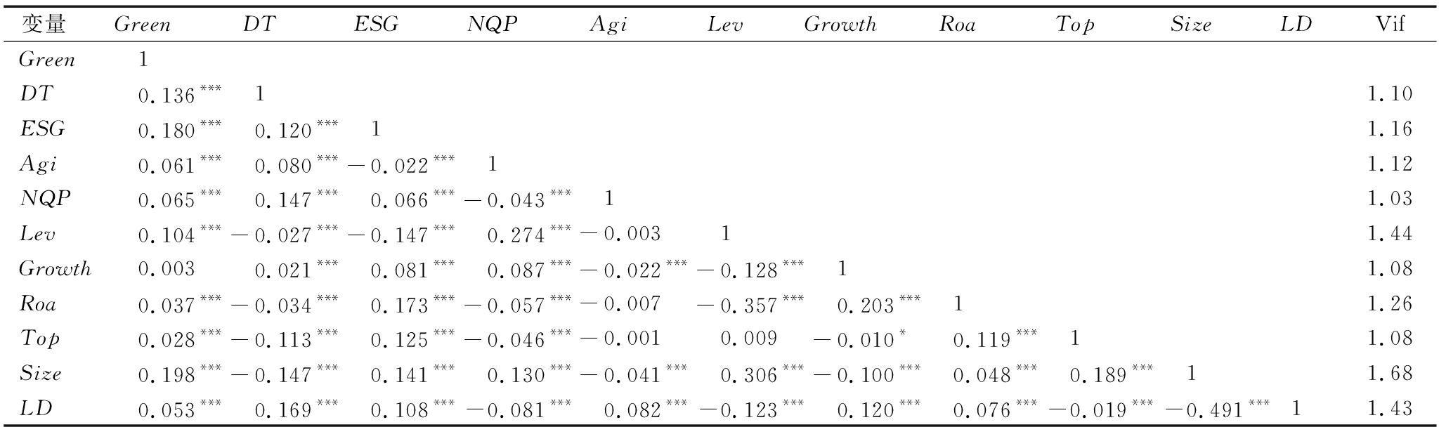 变量GreenDTESGNQPAgiLevGrowthRoaTopSizeLDVifGreen1DT0.136***11.10ESG0.180***0.120***11.16Agi0.061***0.080***-0.022***11.12NQP0.065***0.147***0.066***-0.043***11.03Lev0.104***-0.027***-0.147***0.274***-0.00311.44Growth0.0030.021***0.081***0.087***-0.022***-0.128***11.08Roa0.037***-0.034***0.173***-0.057***-0.007-0.357***0.203***11.26Top0.028***-0.113***0.125***-0.046***-0.0010.009-0.010*0.119***11.08Size0.198***-0.147***0.141***0.130***-0.041***0.306***-0.100***0.048***0.189***11.68LD0.053***0.169***0.108***-0.081***0.082***-0.123***0.120***0.076***-0.019***-0.491***11.43