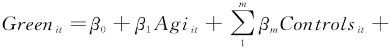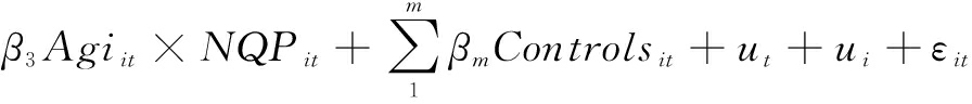 为检验数字化转型对企业绿色创新的促进作用,构建式(1);为检验敏捷响应度以及ESG信息披露的中介作用,构建式(2)~(5),其中,式(2)(3)检验企业敏捷响应度的中介作用;式(4)(5)检验ESG信息披露的中介作用;为检验地方政府新质生产力关注度的调节作用,构建式(6)~(10),其中,式(6)检验城市政府新质生产力关注度在数字化转型与企业绿色创新间的调节作用;式(7)(8)检验城市政府新质生产力关注度在敏捷响应度与企业绿色创新间的调节作用;式(9)(10)检验城市政府新质生产力关注度在ESG信息披露与企业绿色创新间的调节作用。